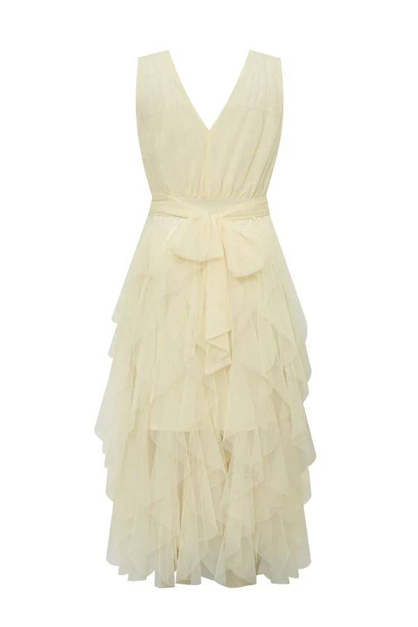 Hihaton tyllimekko kevään ja kesän juhliin. Kauniin vaaleankeltainen väri. Syvään uurrettu V-muotoinen pääntie, sekä selkämys ja rinnan alla joustava kuminauha.  Sivuille on ommeltu nauhat, jotka solmitaan taakse rusetille. Lyhyt alusmekko ommeltu kiinni.