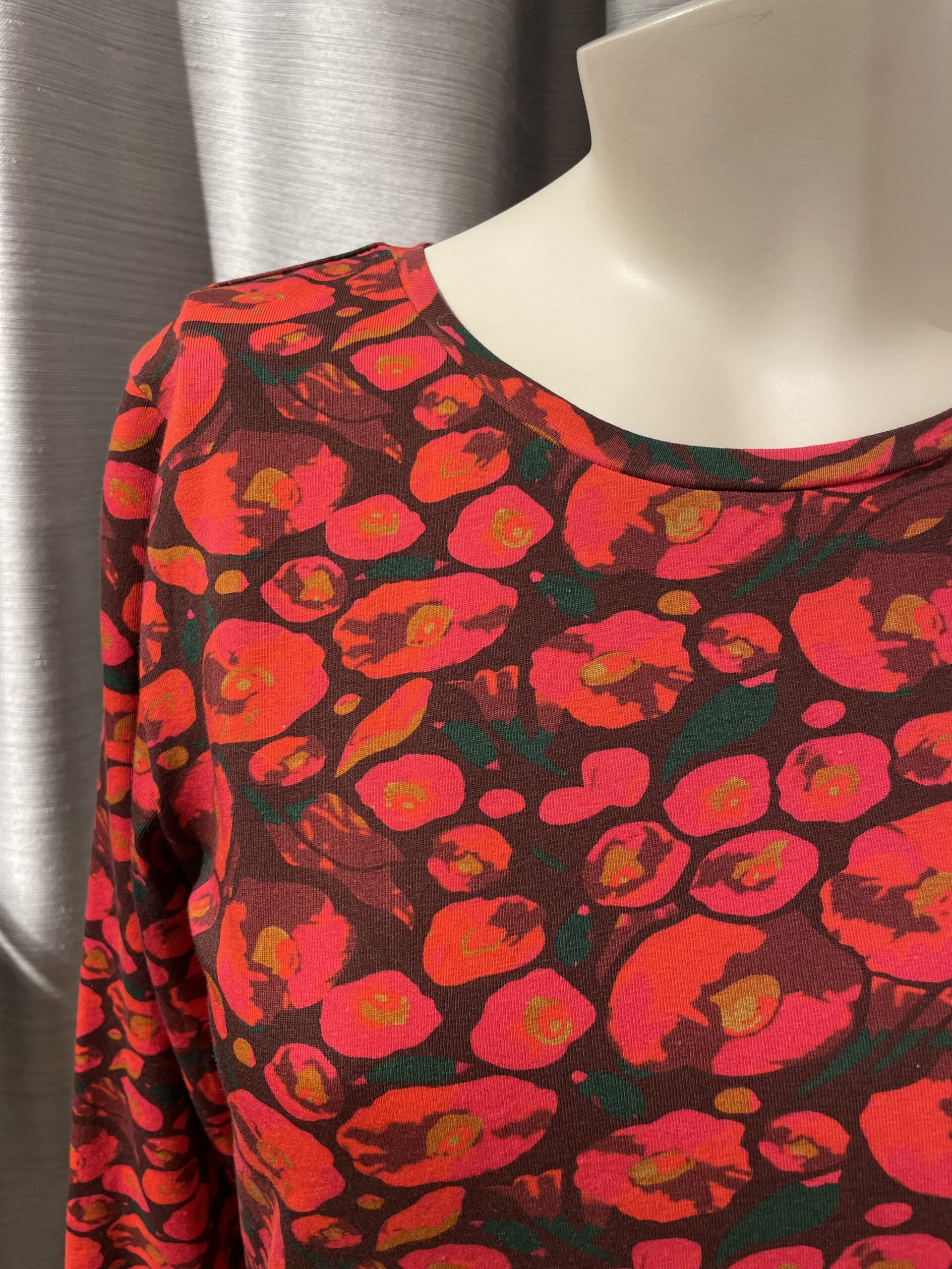 Kauniin mallinen tunika/pusero, jossa on vyötäröllä poikkisauma tuomassa muotoa esiin. Levenevässä helmassa on liikettä ja sivusaumataskut löytyvät molemmin puolin. Täyspitkä hihanpituus ja pyöreä pääntie. Punaisen eri sävyjä ja tehosteeni aavistus vihreää. Sopii hyvin arkeen ja miksei pieneen juhlaankin.