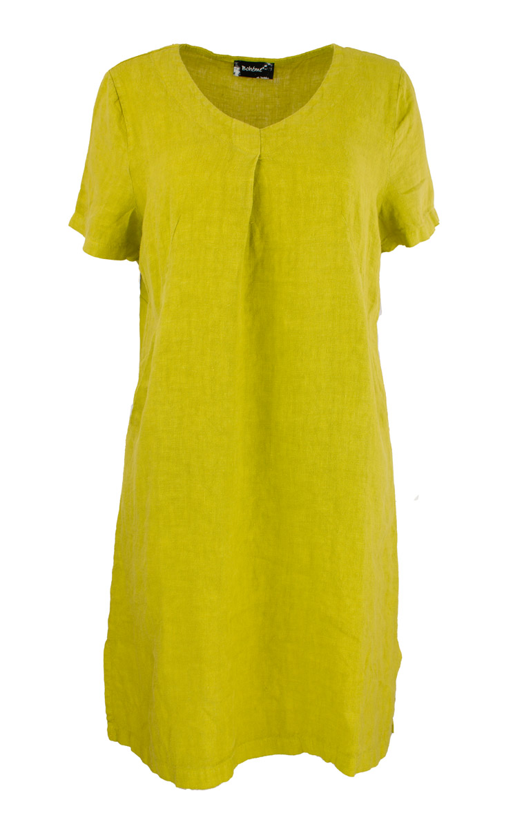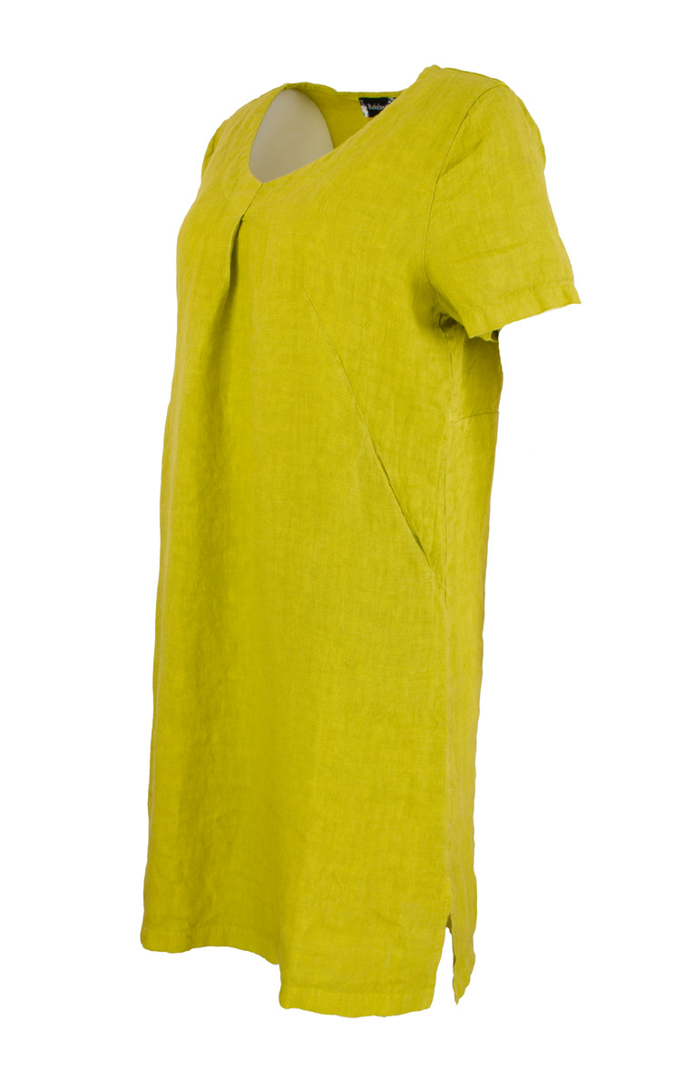 Lyhyt pellavamekko raskaampaa, eli tiheämpään kudottua ja paksumpaa pellavakangasta. Lyhyehkö hihanpituus ja V-muotoinen pääntie. Miehustan pieni laskostus parantaa istuvuutta rinnan kohdalta. Etukappaleen muotolaskoksista avautuvat taskut. Sivuilla pienet halkiot. Värinä syvä limenvihreä. Pidä sellaisenaan kesämekkona tai yhdistä vaikka valkoisiin housuihin.