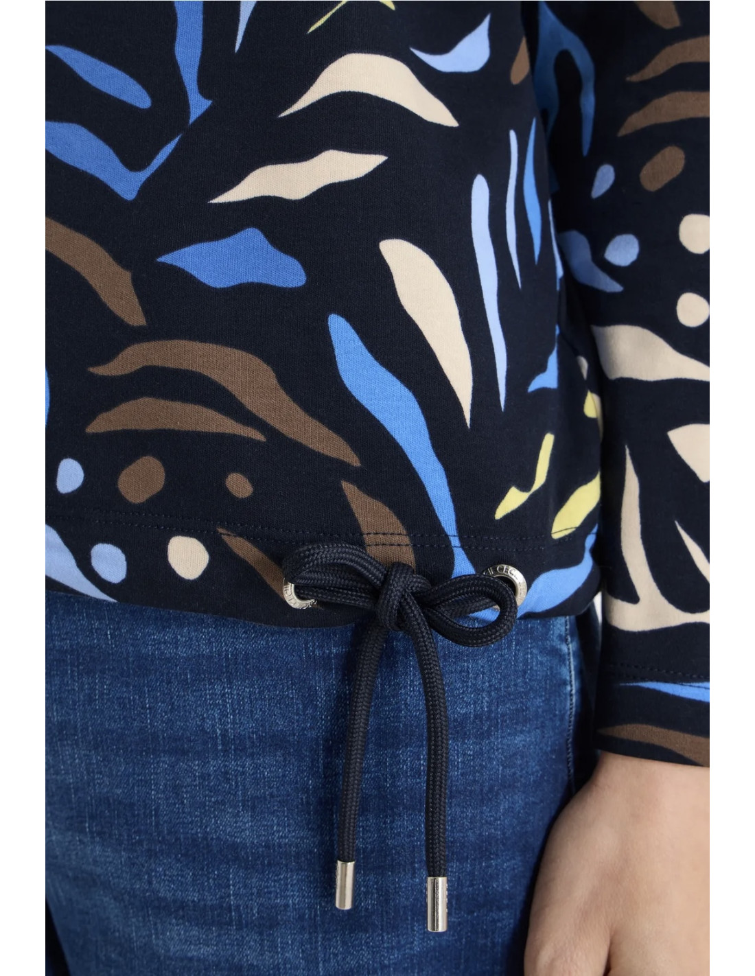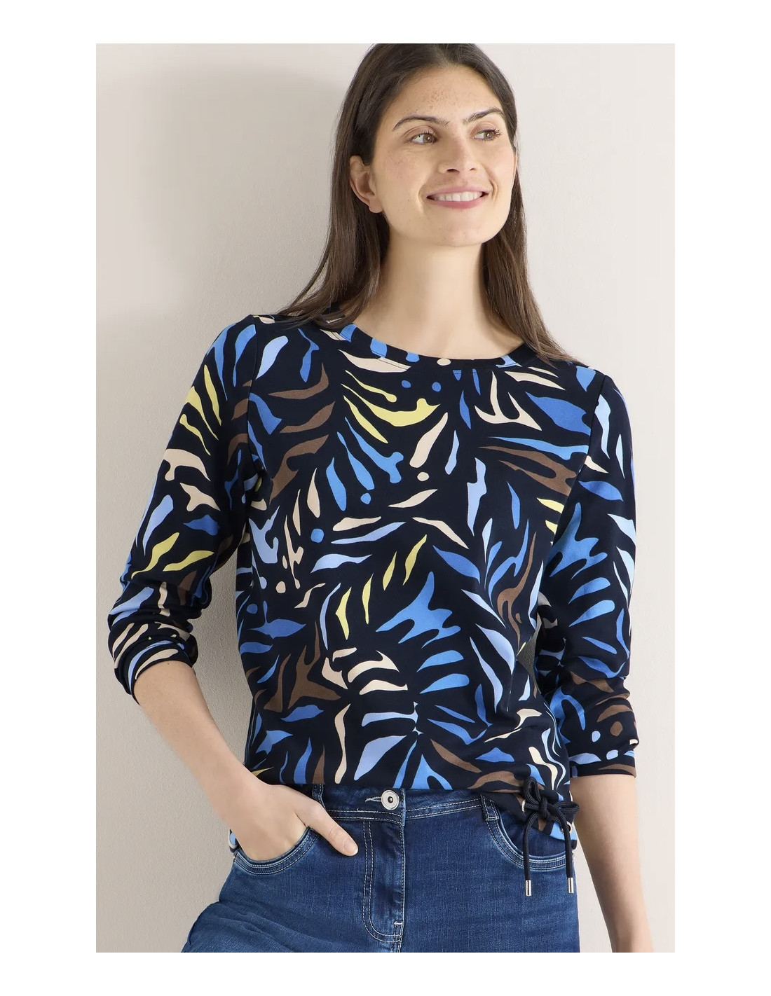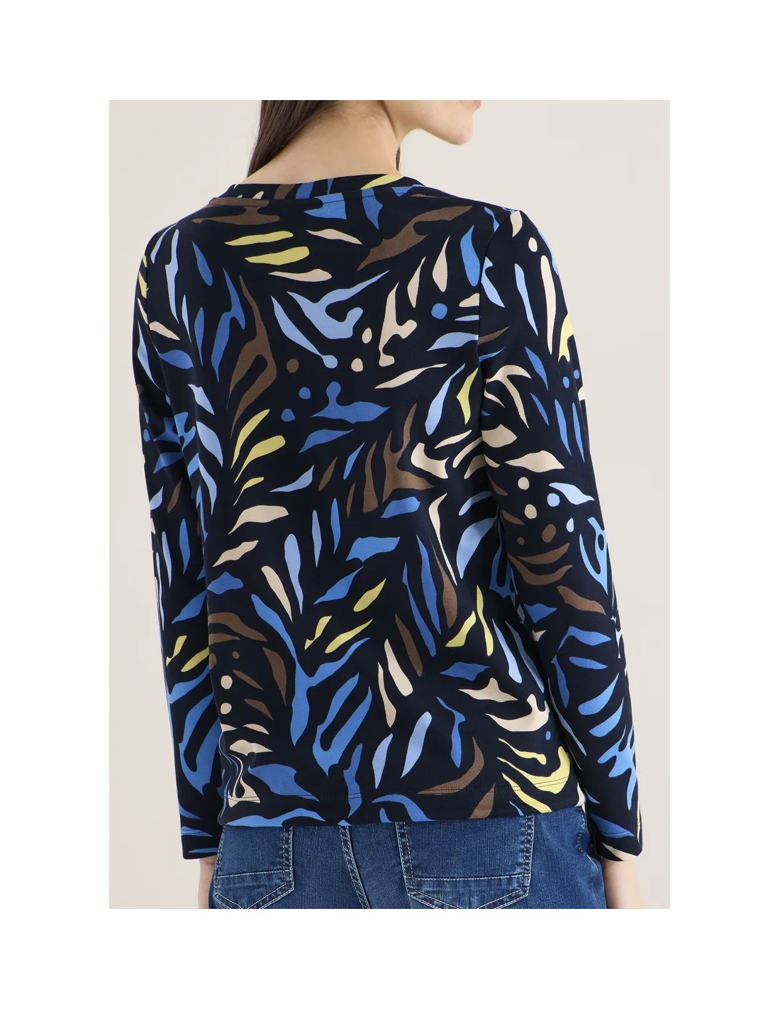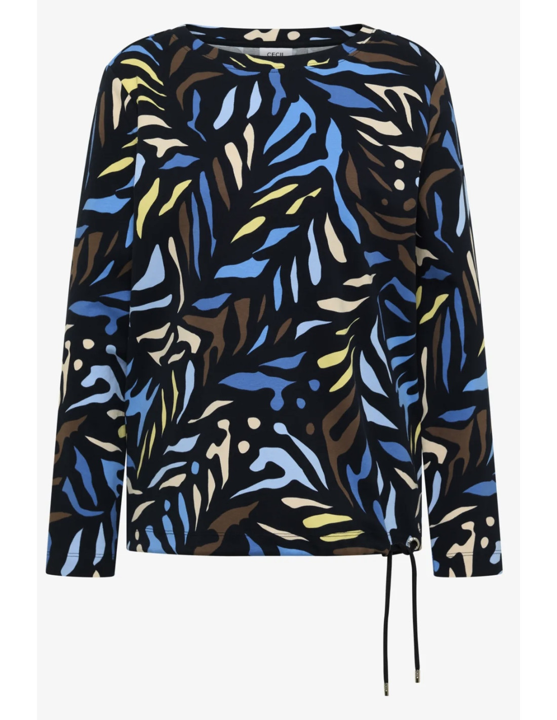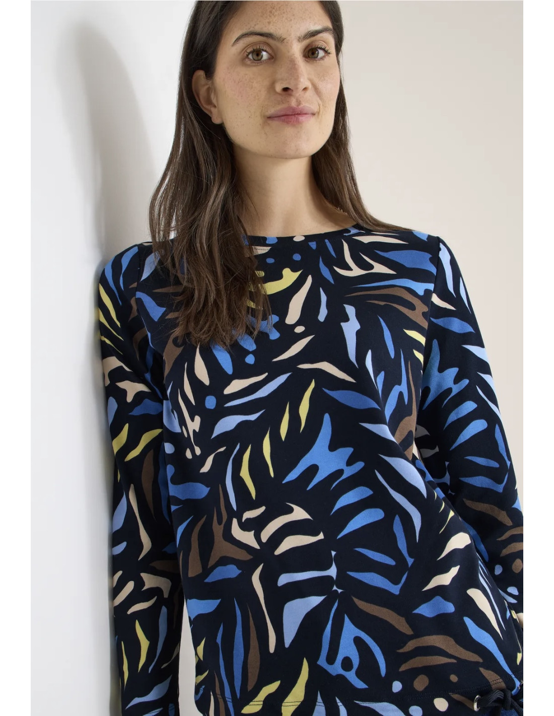 Peruspusero arkeen, jossa pitkät hihat ja pyöreä pääntie. Värityksenä tummansinisellä pohjalla vaaleaa, ruskeaa, keltaista ja sinistä kuviointia. Materiaaliltaan täyttä puuvillaa oleva pusero on helppohoitoinen ja mukavan tuntuinen päällä.