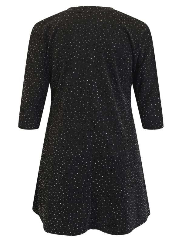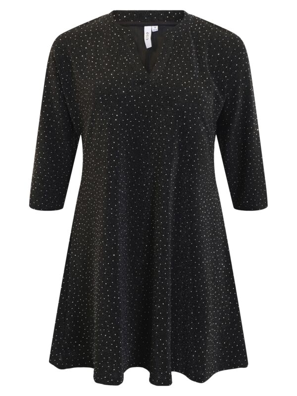 Täydellinen vaate juhlasesonkiin! A-linjainen tunika, jossa sekä kimmeltävää lankaa, että kauniisti valoa heijastavia blig bling -koristekiviä. Malliltaan erityisen imarteleva; ei olkasaumaa, joten istuu monelle eri vartalolle, sekä vajaamittainen hiha. Pääntie on V-muotoinen, joka jättää tilaa korulle ja muutenkin pidentää kaulaa. Lyhyemmällä toimii hyvin myös mekkona!