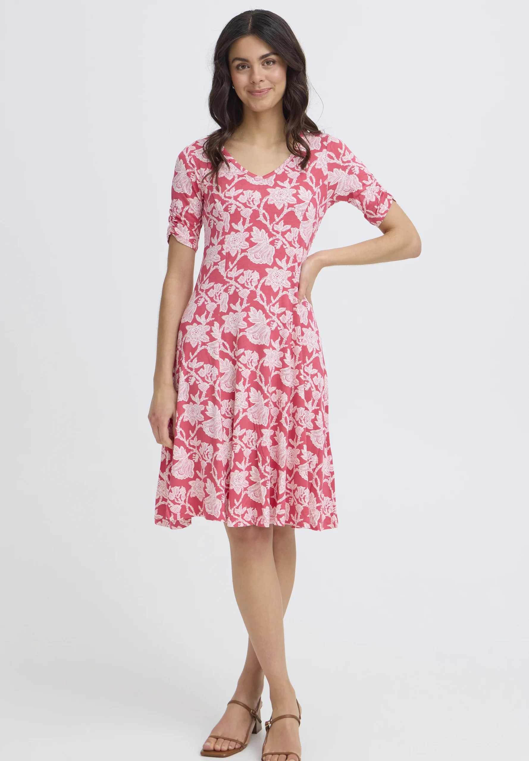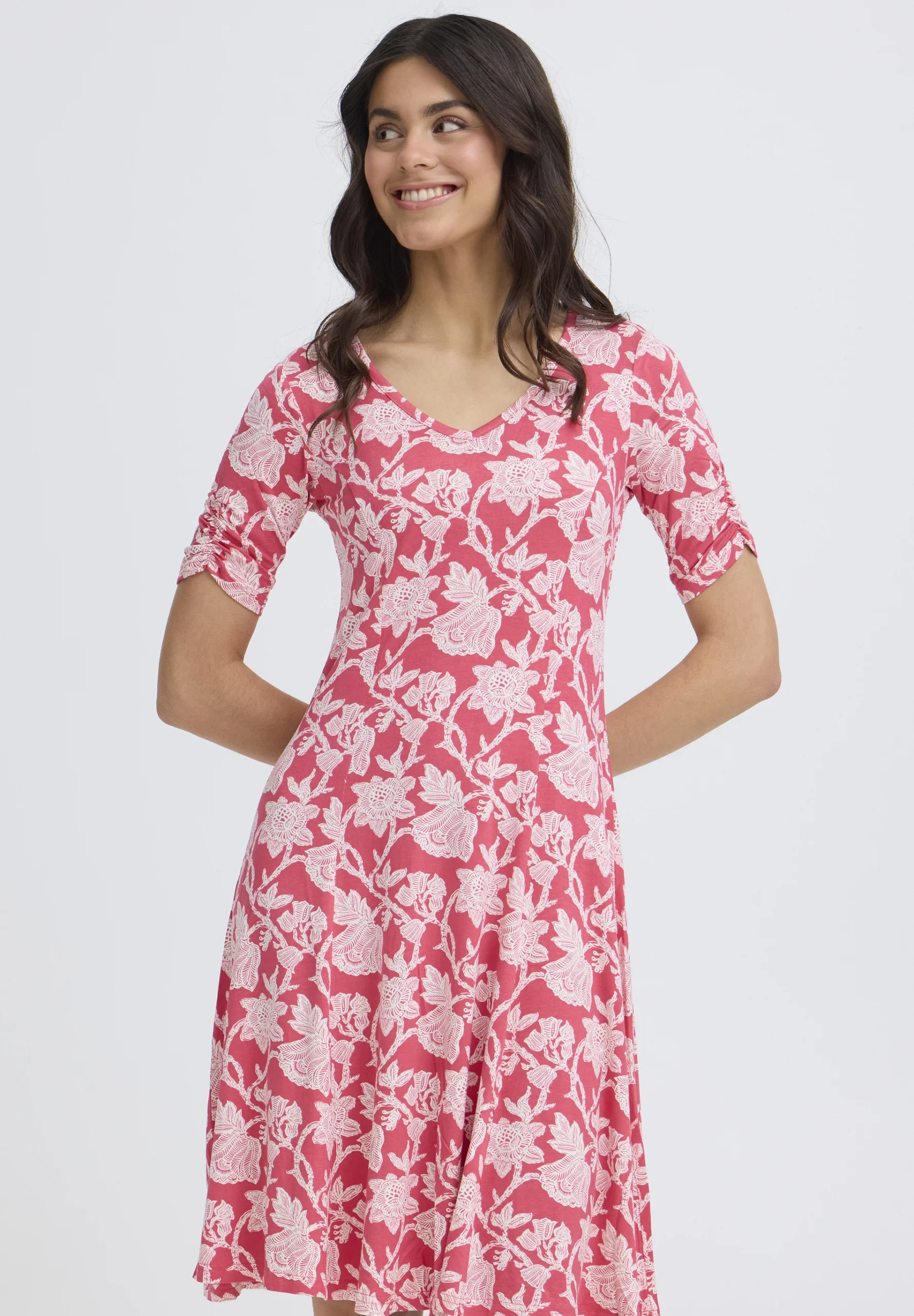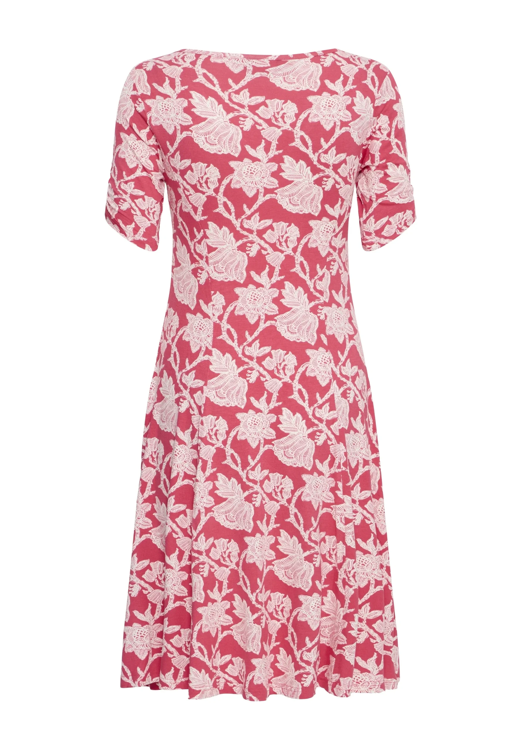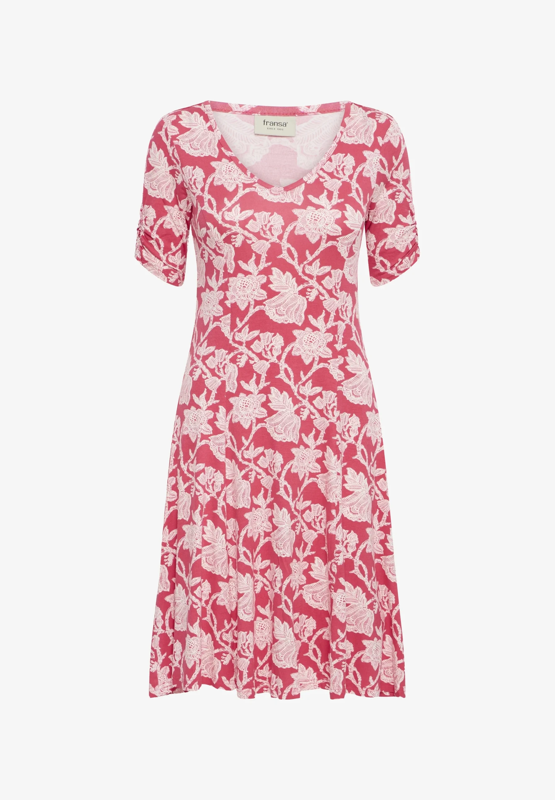 Huoleton ja helppo trikoomekko miellyttävää, hyvin joustavaa viskoosia. Mekossa on tyköistuva malli ja kaunis V-muotoinen pääntie. Hihoissa kiva, pieni rypytys. Helma levenee alaspäin ja hulmuaa ihanasti, joten sopii hyvin myös tanssimekoksi. Värityksenä punaisella pohjalla valkoista kukkaköynnöstä.