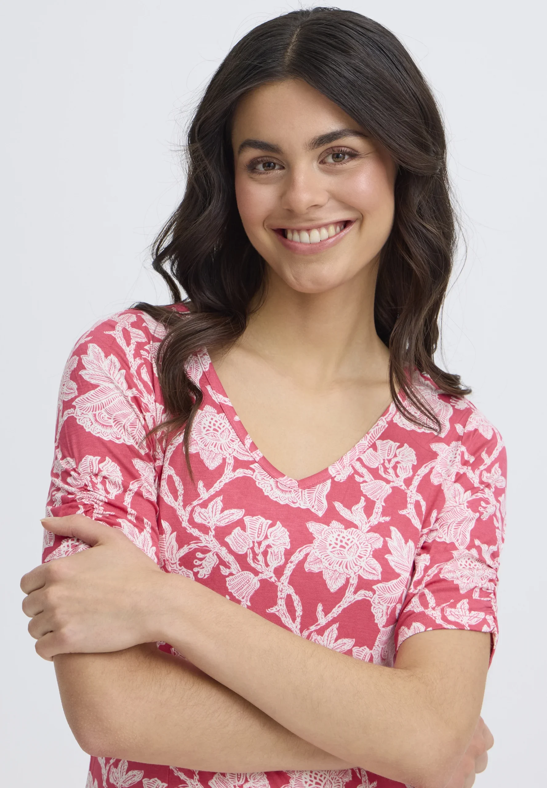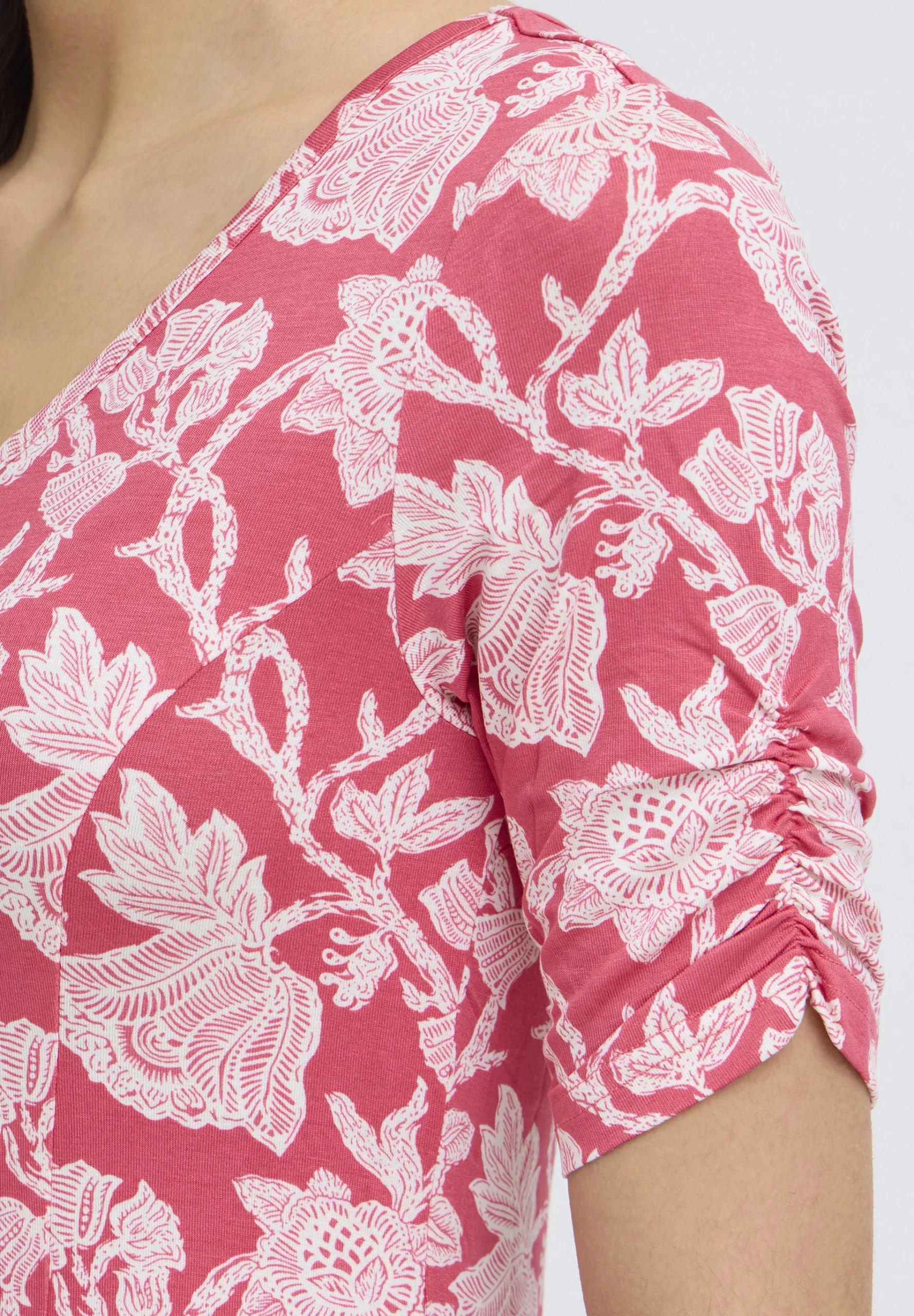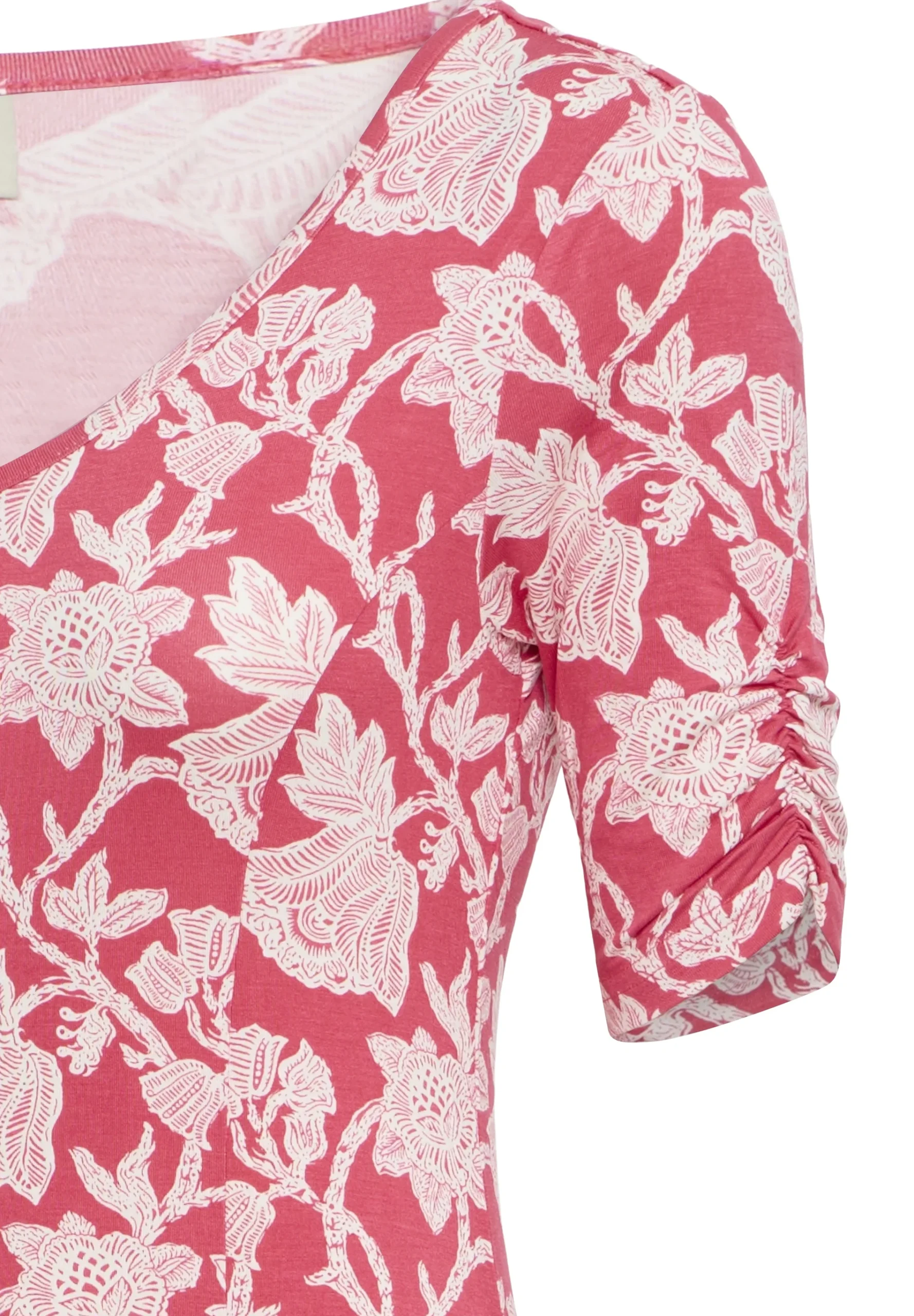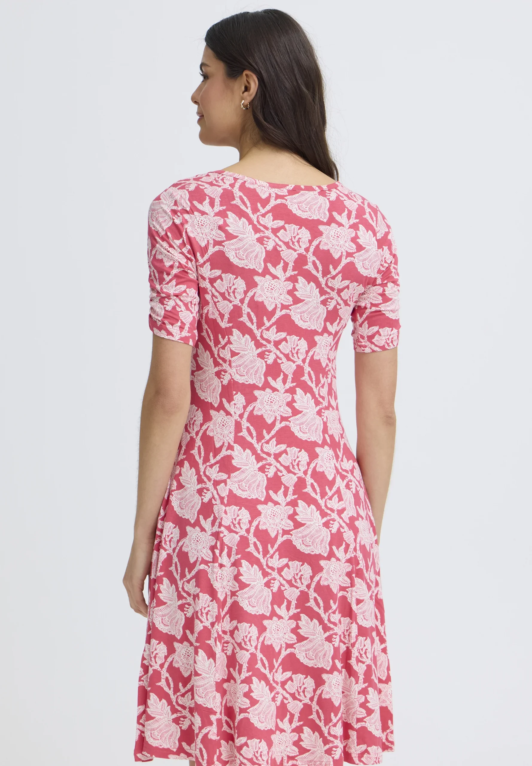 Huoleton ja helppo trikoomekko miellyttävää, hyvin joustavaa viskoosia. Mekossa on tyköistuva malli ja kaunis V-muotoinen pääntie. Hihoissa kiva, pieni rypytys. Helma levenee alaspäin ja hulmuaa ihanasti, joten sopii hyvin myös tanssimekoksi. Värityksenä punaisella pohjalla valkoista kukkaköynnöstä.