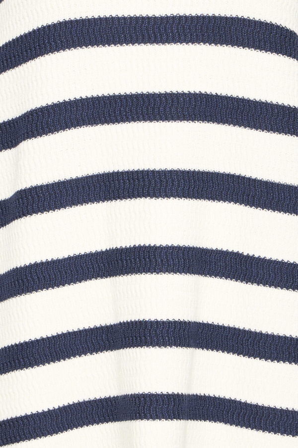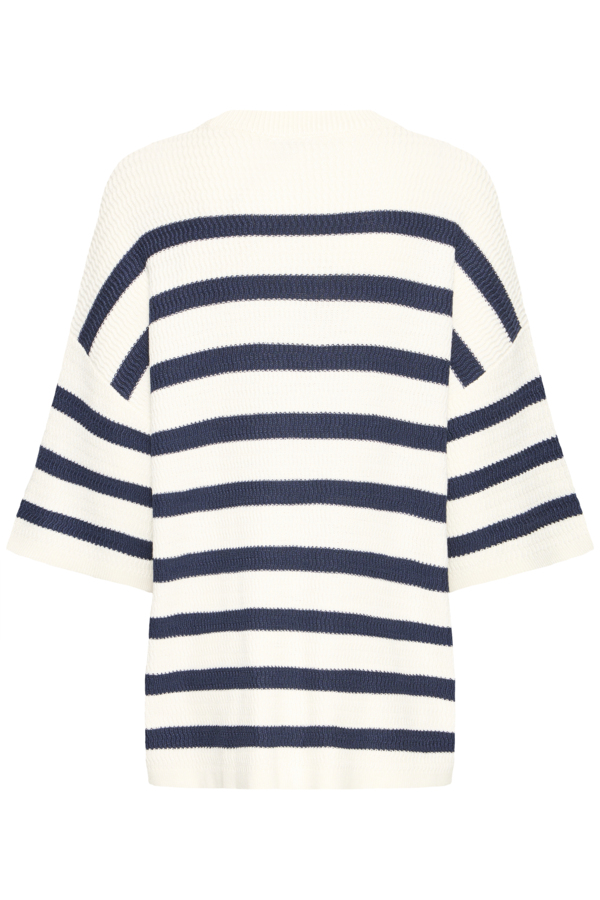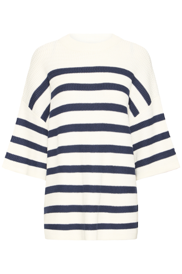 Neulepusero vajaalla hihalla ja pyöreällä pääntiellä. Todella väljä malli ja erityisen joustava neulos. Tummansinisen ja valkoisen yhdistelmä raitakuosissa on ajaton klassikko, joka näyttää aina hyvältä. Yhdistä oversize kokoinen pusero esimerkiksi väljään valkoiseen hameeseen.