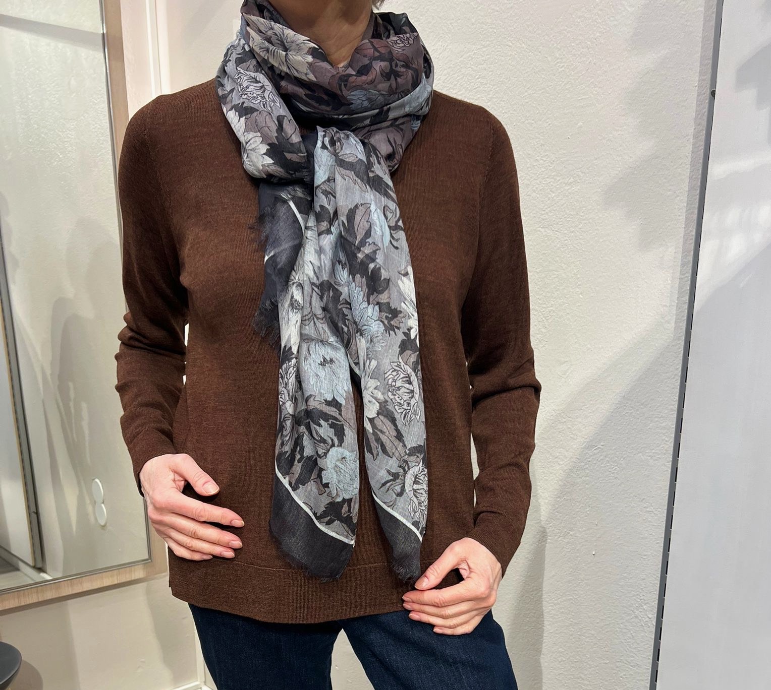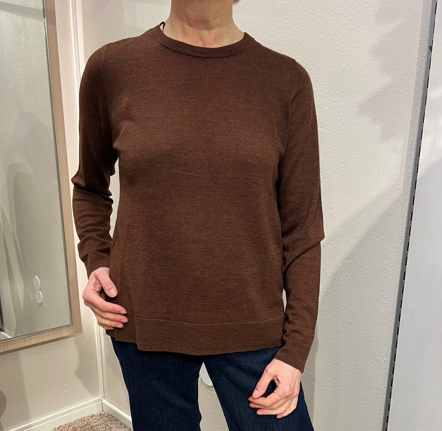 Kaunis suklaanruskea neule on mukavan ohutta villaa. Pieni pyöreä pääntie, johon sopii huivi hyvin. Malliltaan neule on rennon suora.