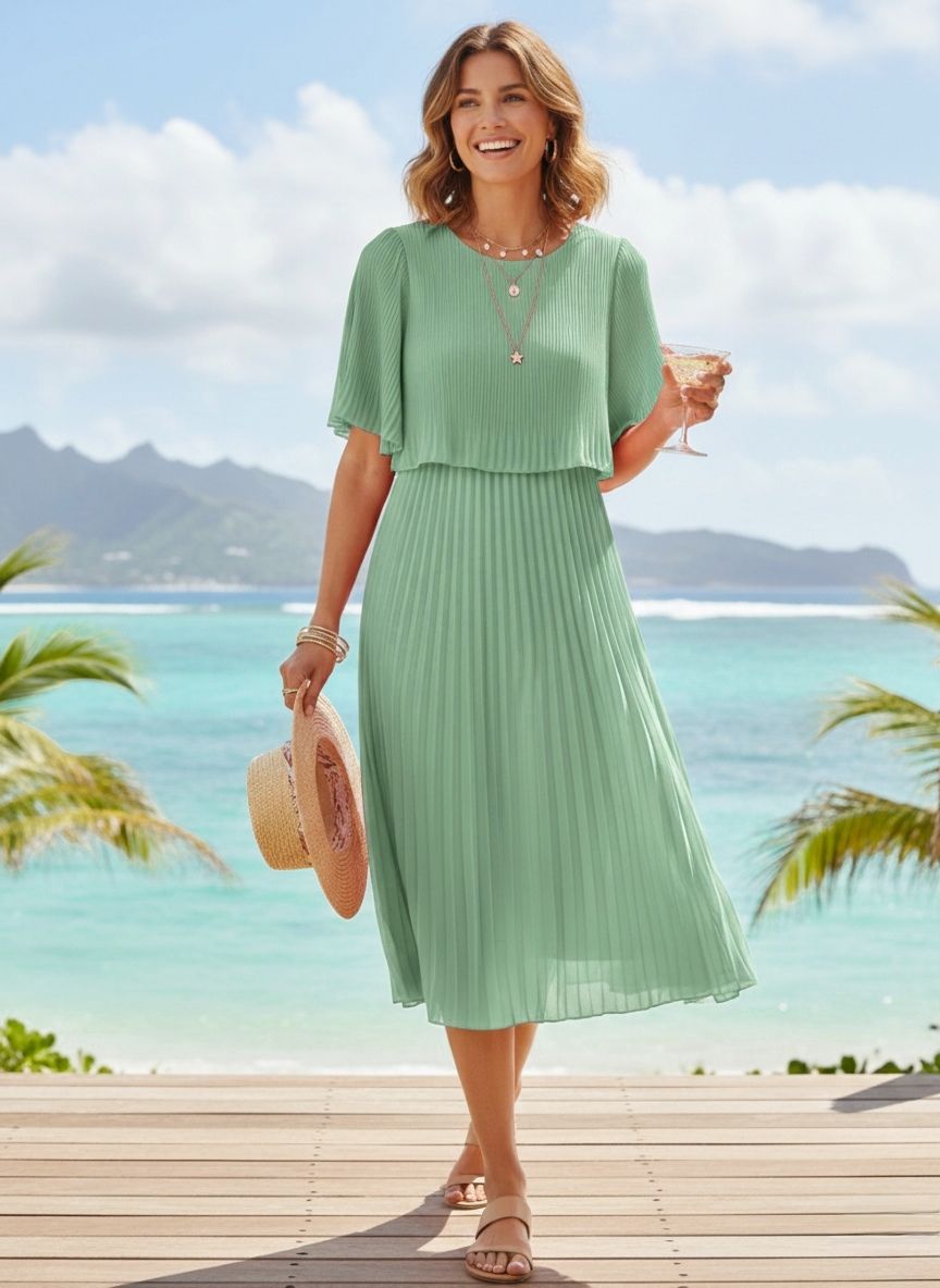 Tyylikäs ja kauniin keveä mekko, joka sopii erityisesti juhlasesonkiin! Yläosasta väljästi istuva ja tiheästi pliseerattu, sekä pyöreä pääntie. Hihat ovat väljät ja juuri sopivan pituiset ja peittävät, suunnilleen kyynärpäähän asti. Hame-osuus on leveämpää pliseerausta. Mekossa on hyvin joustava vuorikangas, joten siitä ei kuulla läpi. Vyötäröllä kulkee kuminauha, joka joustaa reilusti. Värinä hieman utuinen mintunvihreä.