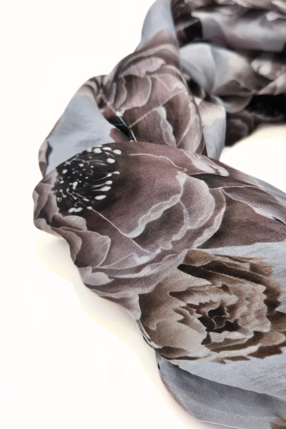 Kuvioitu tuubihuivi kevyttä ja ilmavaa silkkiä. Sopii arkeen ja juhlaan ja tuubimalli on helppo pukea. Kuosissa pioneita ja värityksenä harmahtavia ja rusehtavia sävyjä.