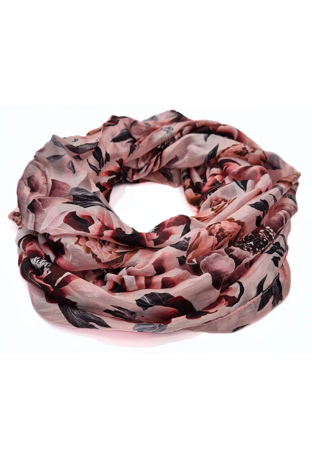 Kuvioitu tuubihuivi kevyttä ja ilmavaa silkkiä. Sopii arkeen ja juhlaan ja tuubimalli on helppo pukea. Kuosissa pioneita ja värityksenä erilaisia roosan sävyjä.