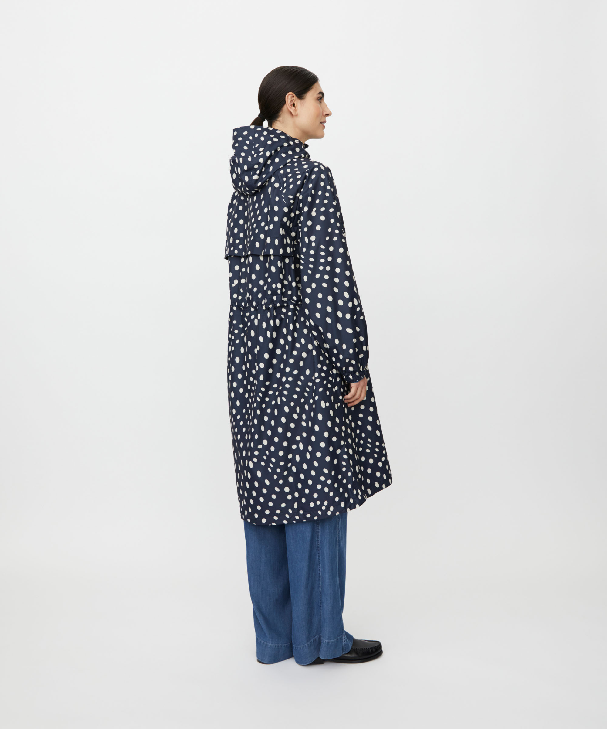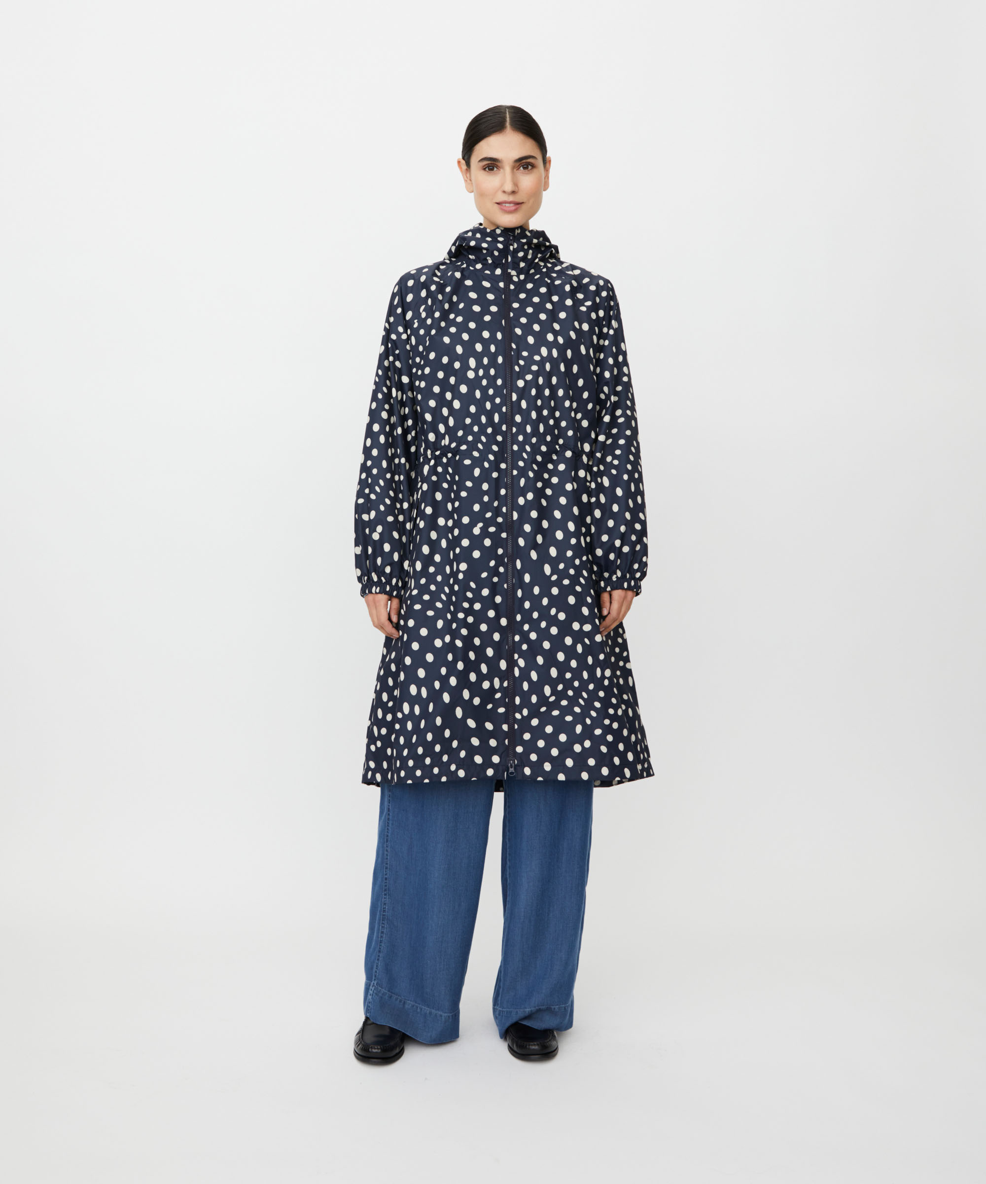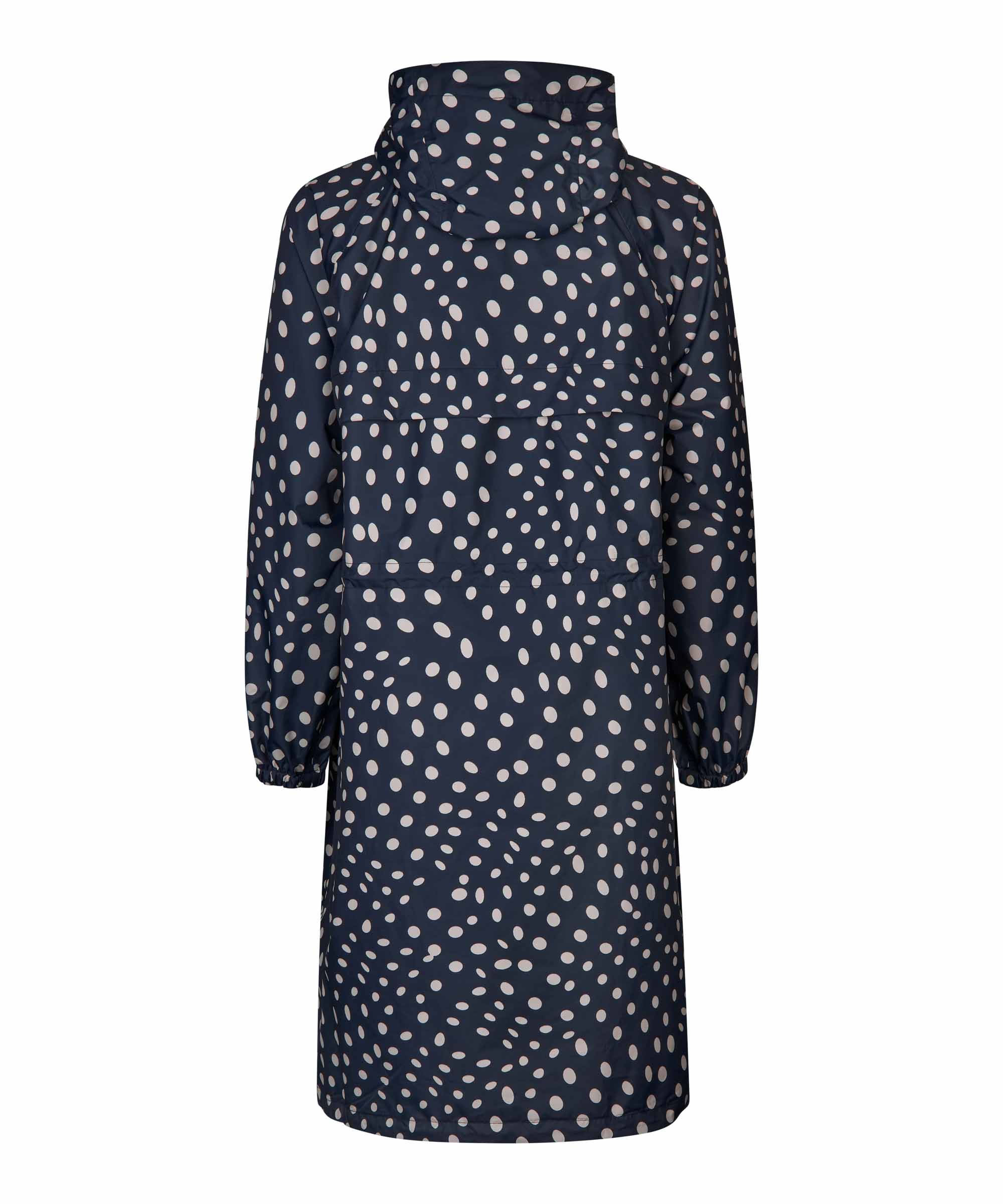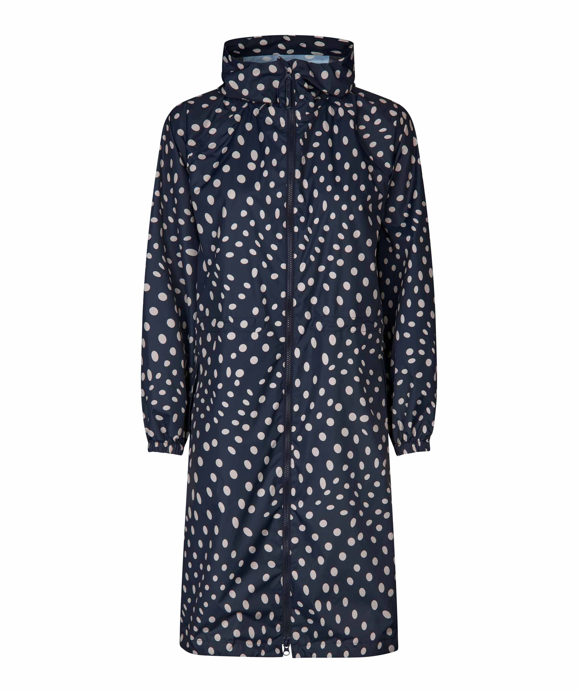 Sadetta ja tuulta pitävä kevyt materiaali. Tummansinisellä pohjalla beigenvärisiä palloja.