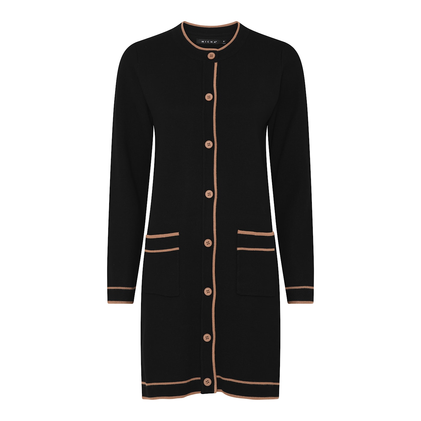 Pientä persoonaa tähän neulejakkuun tuo ruskeansävyiset raidat nappilistassa, hihansuissa ja helmassa, sekä taskuissa. Napit ovat samaa sävyä myös. Edessä on pienet ja avonaiset taskut. Pyöreä pääntie ja täyspitkä hihanpituus. Klassinen malli, joka toimii aina.