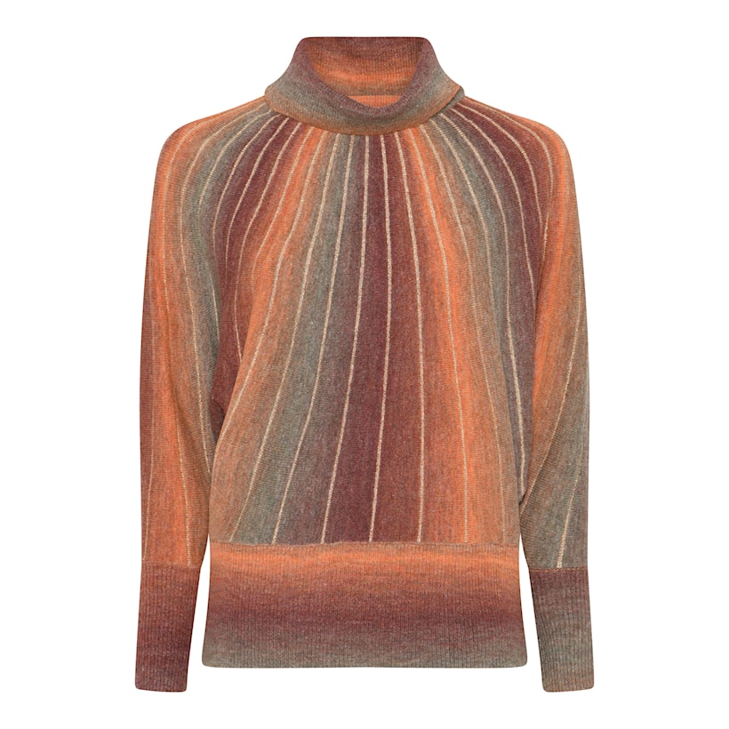Murrettuja sävyjä ja kimmellystä. Upean mallinen pusero, jossa yksityiskohdat kohdillaan. Poolokaulus on omiaan kylmemmillä ilmoilla. Täyspitkä hihanpituus ja pituus lanteille. Todella näyttävä neule sopii hyvin myös juhlaan ja näyttää upealta hameen kanssa!