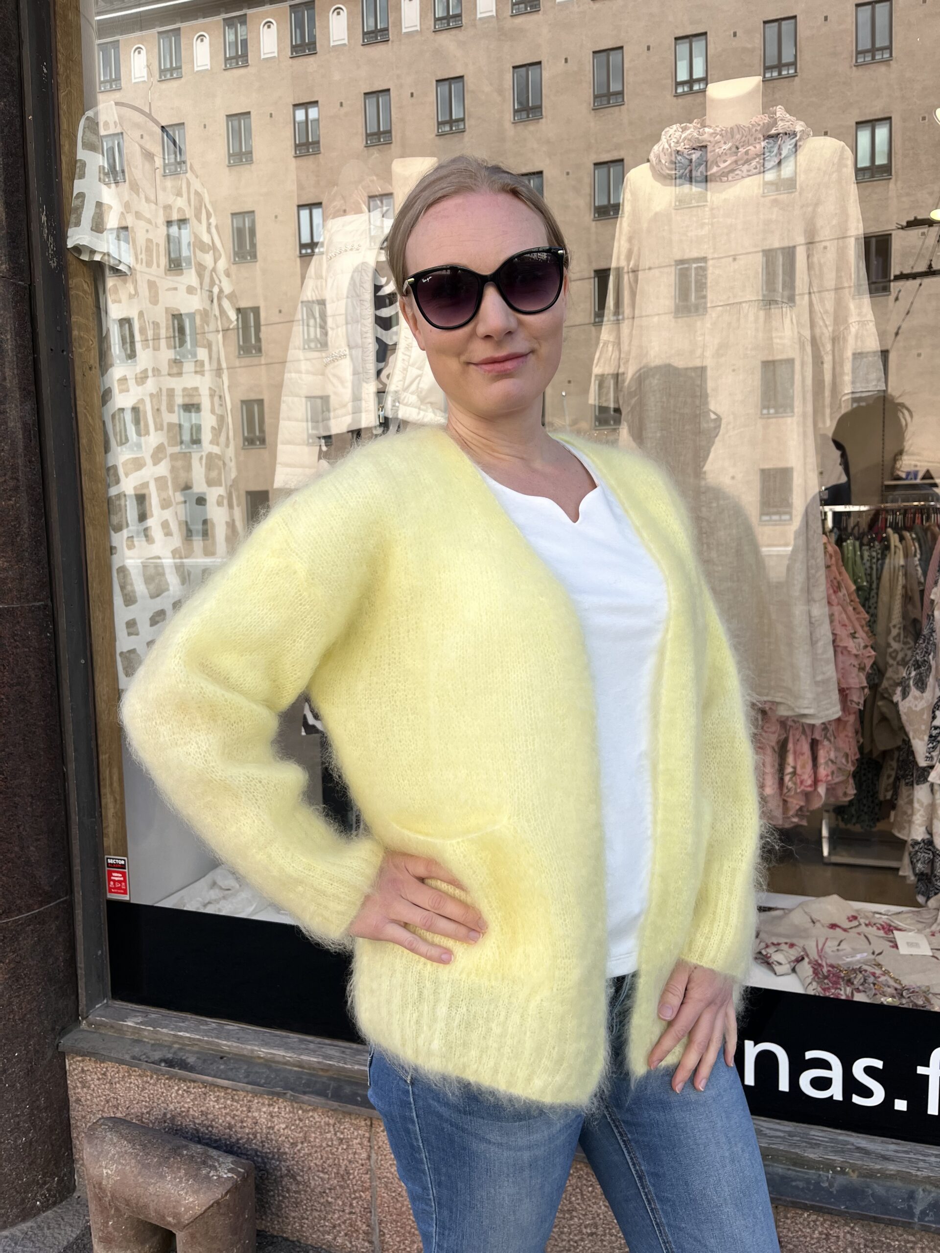 Yhdenkoon avonainen mohairneuletakki keltaisena. Täyspitkät hihat ja hihansuissa pieni neulosjoustinresori. Edessä taskut.