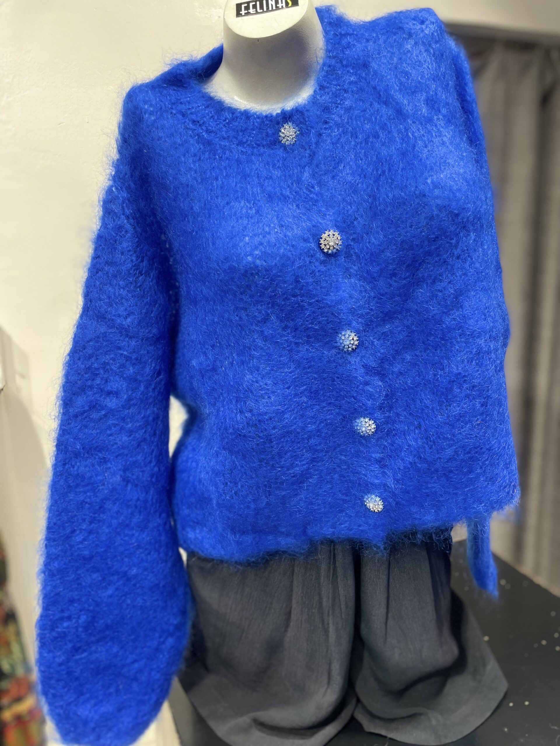 Kirjoita ensimmäinen arvio tuotteelle “Mohairneuletakki timanttinapeilla, sähkönsininen”