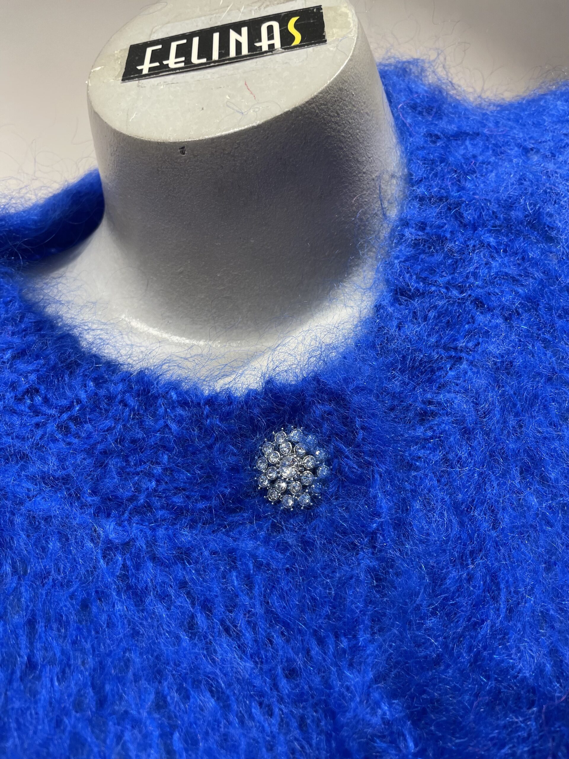 Erittäin trendikäs pörröneule on ihanan lämmintä ja pehmeää mohairia. Reilun kokoinen, mutta ajaton ja  klassinen malli, jossa on pyöreä pääntie ja täyspitkä hihanpituus. Hihansuissa on kuminauha. Timanttinapit ovat näyttävä yksityiskohta! Värinä sähäkkä sähkönsininen.