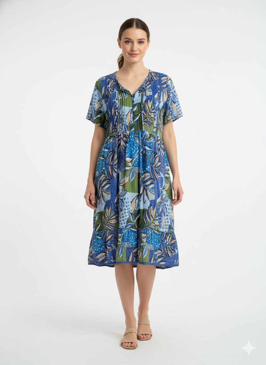 Kevyt puuvillamekko mukavan leveällä hihalla ja lyhyellä hihanpituudella. A-linjainen mekko on miellyttävä päällä, vyötäröllä on poikkisauma, joka parantaa mekon istuvuutta. Miehustassa pieni laskostus. Pääntie on pyöreä solmittavin nauhoin ja koristetupsuin. Mekossa on taskut ja helmaa koristaa pieni frilla. Värinä sinistä ja vihreää.