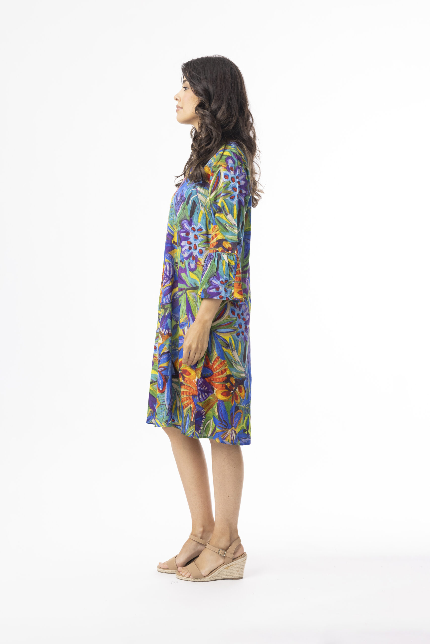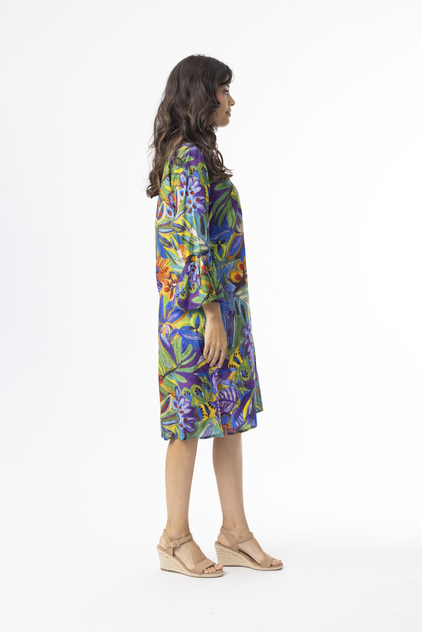 Runsas kuvioinen ja ihanan värikäs mekko hieman levenevin, vajaamittaisin hihoin ja levenevällä helmalla. Pääntie on pyöreä. Materiaali on kauniisti laskeutuvaa ja himmeähohtoista, mekko sopii hyvin myös juhlaan! Mekossa on värikylläinen värimaailma, joten asusteita vaihtamalla saat sen taipumaan moneen erilaiseen tilaisuuteen.