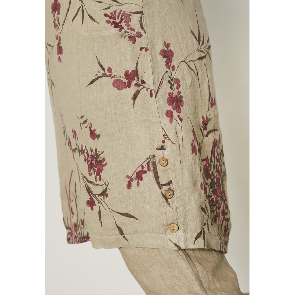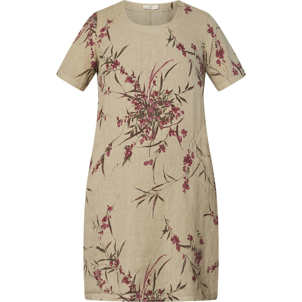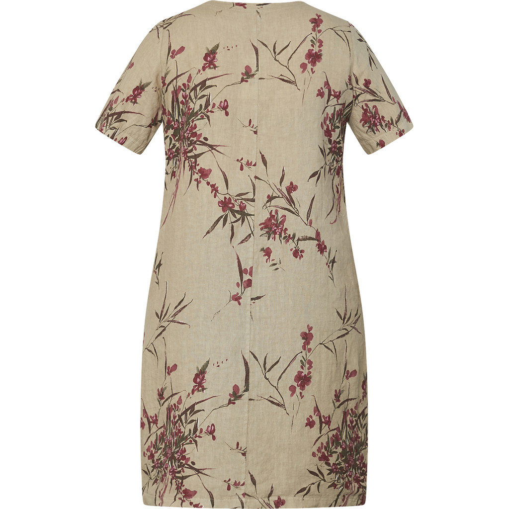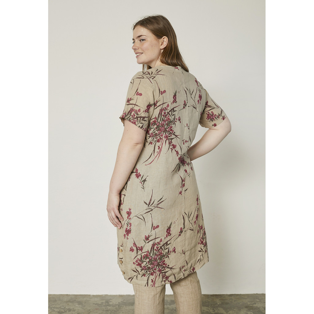 Neutraalin värinen pellavamekko, jossa on kaunis tumman fuksian värinen kukkakuosi. Reilun kokoinen hiha suojaa ja peittää. Pääntie on pyöreä. Sivusaumataskut molemmin puolin ja etukappaleella koristetikkaus. Takakappale on aavistuksen pidempi. Suoran mallinen mekko sopii hyvin myös kesäjuhlaan!