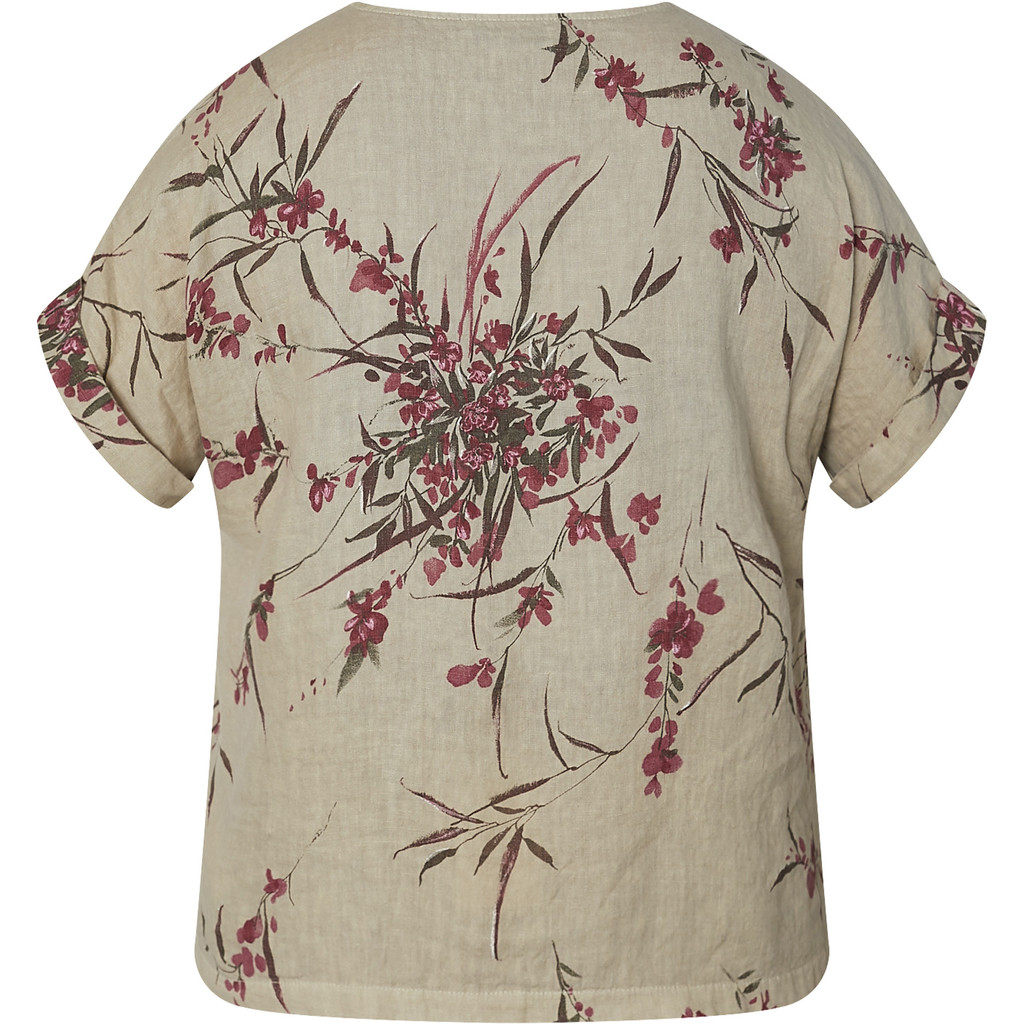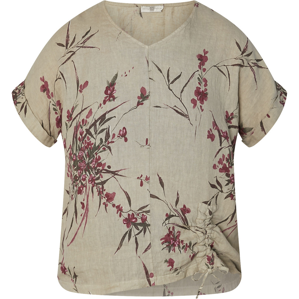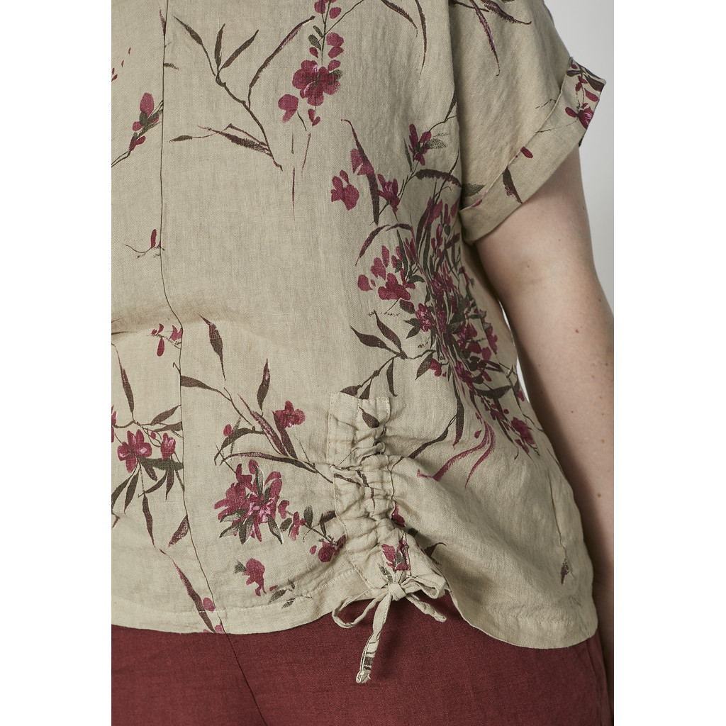 Olkasaumaton pellavapusero holkkihihalla ja V-muotoisella pääntiellä. Pusero on väriltään klassinen neutraali pellavansävy ja siinä on tumman fuksian värisiä kukkia. Helmassa on toisella puolella solmittava kiristysnauha, joka tuo muuten väljän malliseen puseroon kivaa muotoa ja jujua. Keskellä kulkee pystysauma.