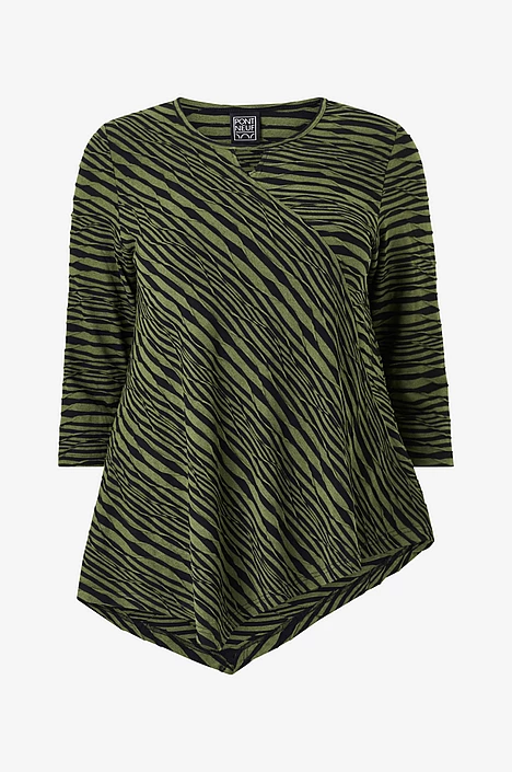 Graafinen, raidallinen tunika moneen menoon. Viistoraidoitus ja tunikan leikkaus on vartaloa imarteleva. Pyöreä pääntie, jossa pieni v-aukko, hihan pituus 3/4.