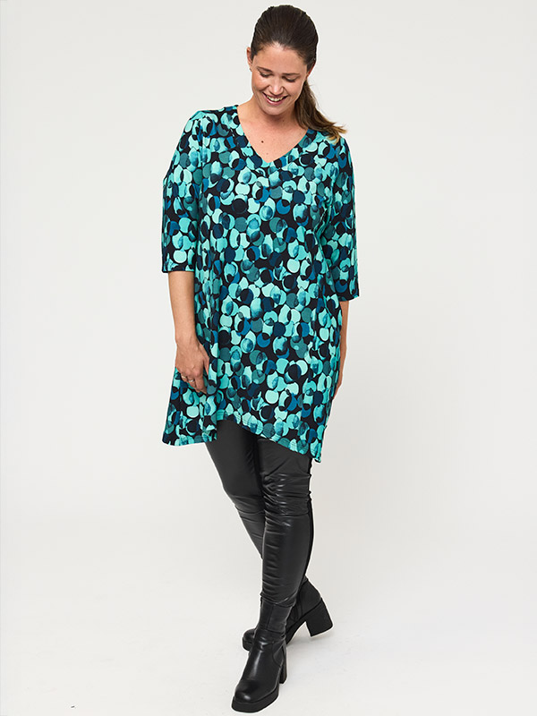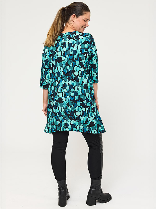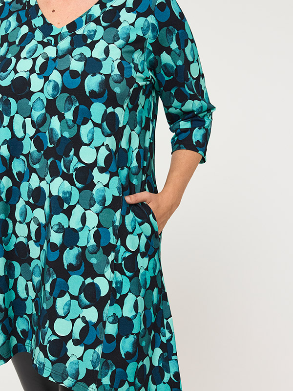 Helppohoitoinen trikootunika joustaa hyvin ja on mukava vaate päällä. Kauniin turkoosinsävyinen kuviointi on raikas ja sopii ympärivuotiseen käyttöön. Pääntie on V-muotoinen ja hihanpituus vajaamittainen. Plussaa taskuista! Helma on hieman epäsymmetrinen ja pituutensa puolesta sopii yhdistettäväksi niin leggingseihin, kuin leveämpiinkin housuihin.