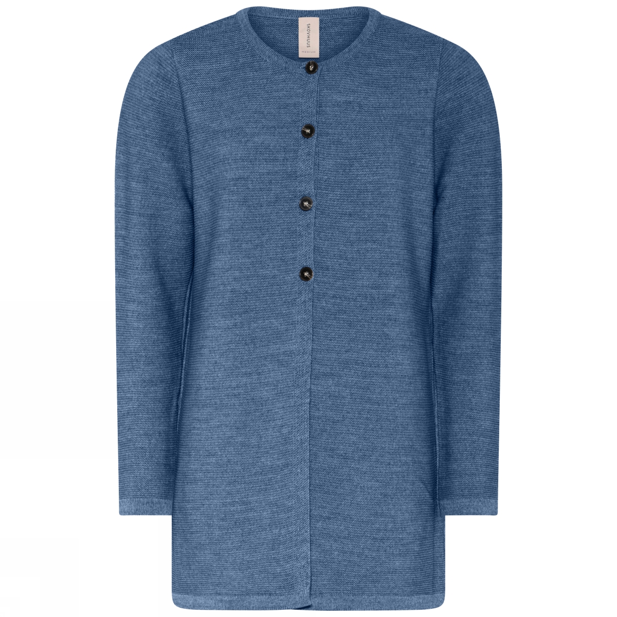 Suora, pitkä neuletakki toimii monessa eri tilanteessa niin takkina kuin jakkuna. Joustava, mutta hyvin napakka materiaali pitää mallinsa ja istuu hyvin. Pyöreä pääntie ja edessä neljä nappia, sekä taskut. Hihanpituus on täyspitkä. Helppohoitoinen ja käyttöä kestävä materiaalien sekoitus on miellyttävä käytössä. Ei tarvitse silittää! Värinä indigo.