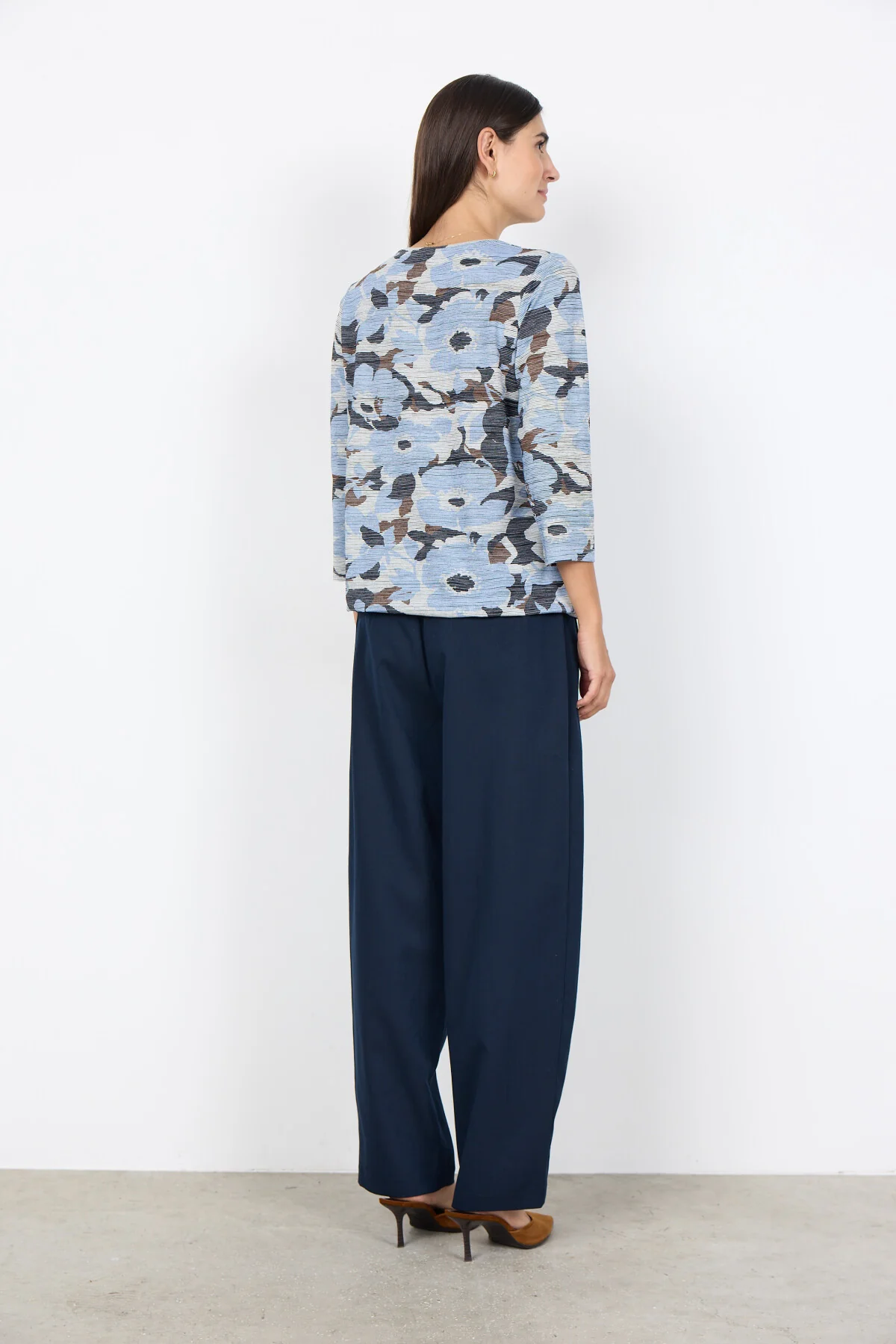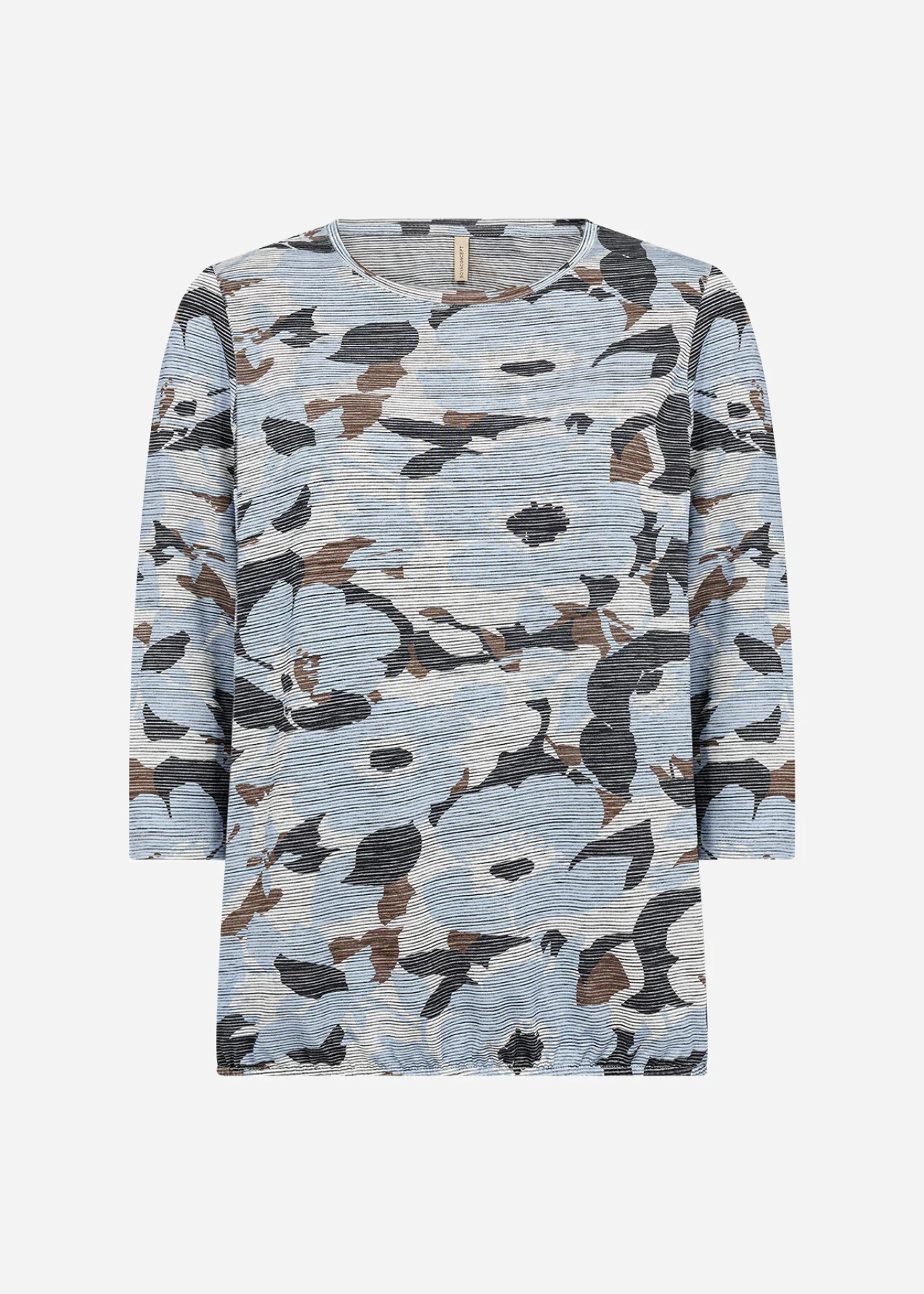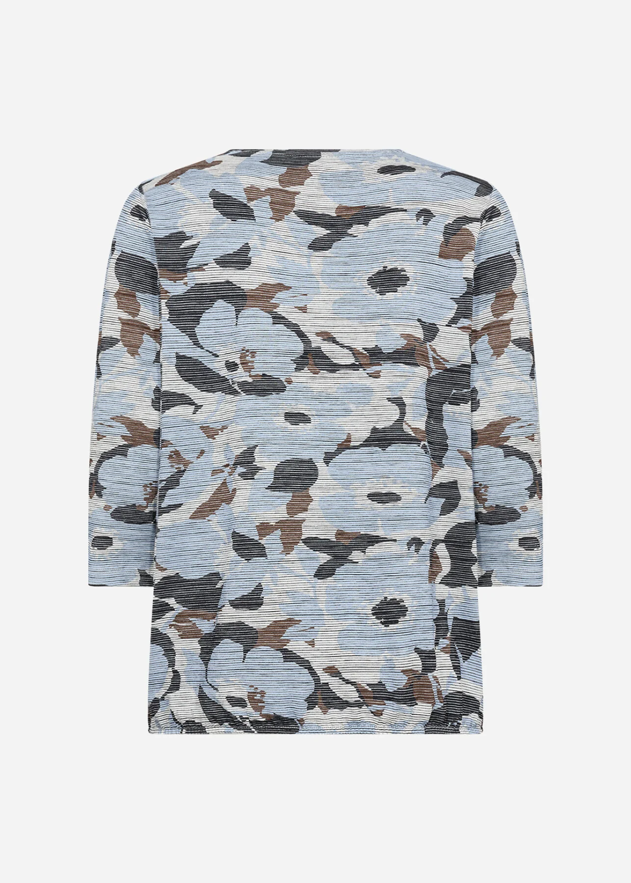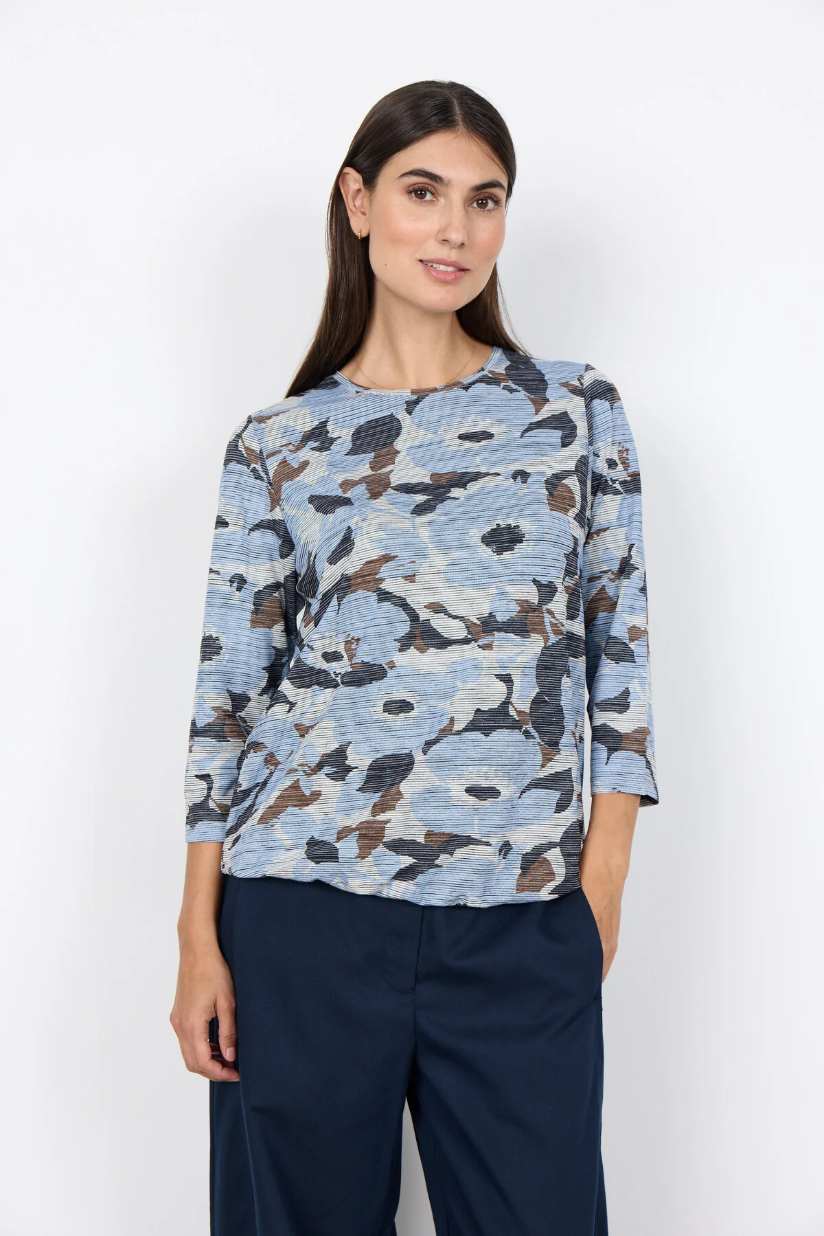 Hyvin joustavassa puserossa on raikas sinisävyinen värimaailma ja pientä raitaa. Kuosina unikkomaisia kukkia. Pyöreä pääntie nousee korkealle ja hihanpituus on vajaamittainen. Helmassa on kuminauha, jonka avulla puseron istuvuutta saa helposti vaihdeltua. Helppohoitoinen materiaali, ei tarvitse silittää ja kestää hyvin käyttöä!
