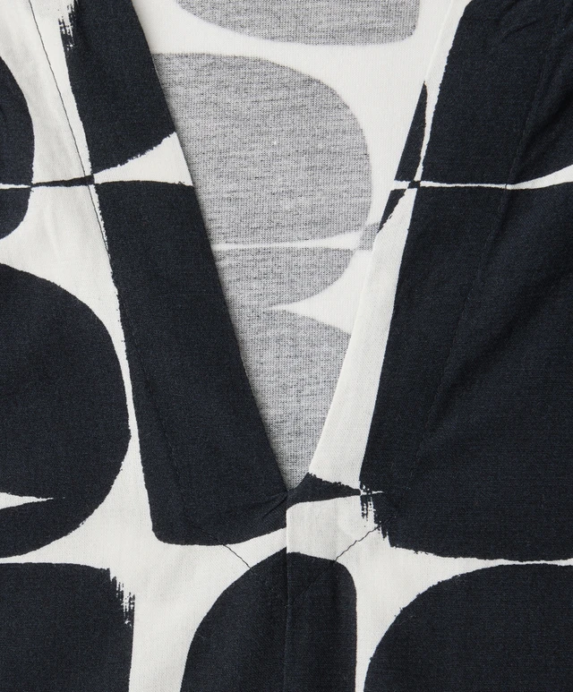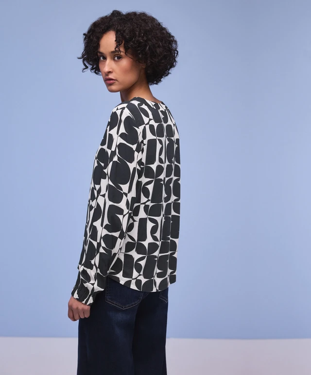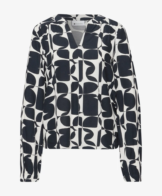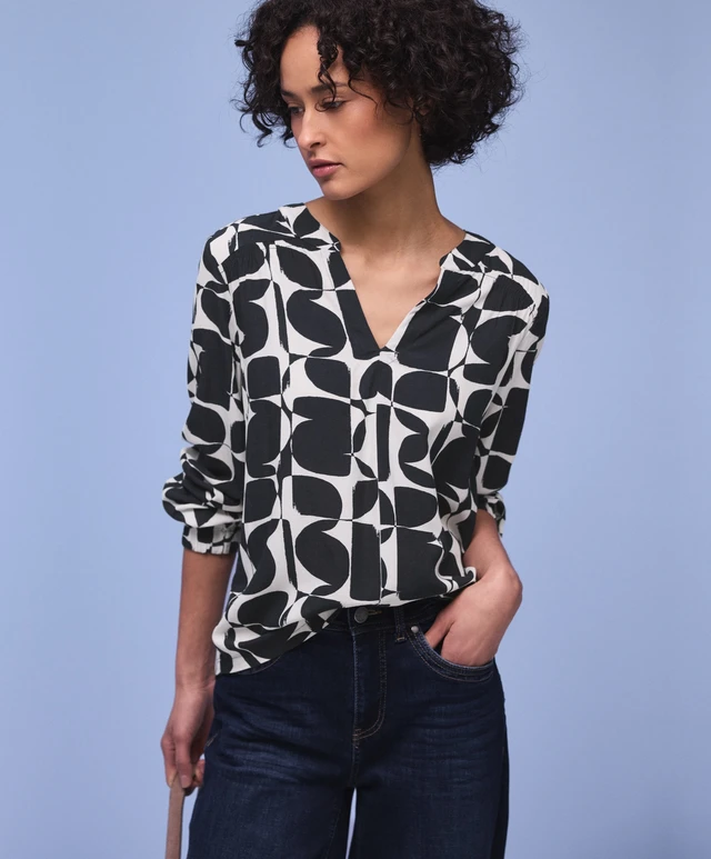 Tyylikäs ja helppohoitoinen pusero, jonka selkäpuoli on joustavaa materiaalia ja etupuoli kauniisti laskeutuvaa viskoosia. Miellyttävä päällä ja erityisen toimiva jakkujen ja neuletakkien alla. V-muotoinen pääntie ja täyspitkä hihanpituus. Hihansuissa on leveähkö kuminauha. Värityksenä todella tummansininen ja valkoinen.