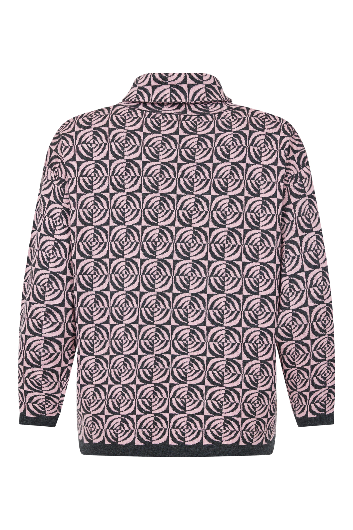 Vaaleanpunainen ja harmaa yhdistyy hauskasti tässä neuleessa, jossa on näyttävä kuviointi. Poolokaulus lämmittää mukavasti. Täyspitkässä hihassa ja helmassa kulkee raita. Materiaali on kivan tuntuista ja helppohoitoista sekoitetta, joka pitää hyvin muotonsa ja palvelee pitkään.