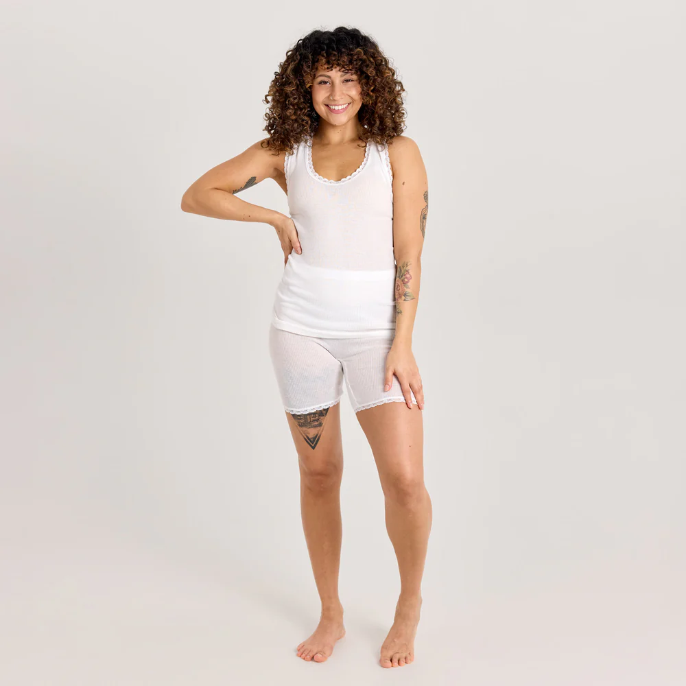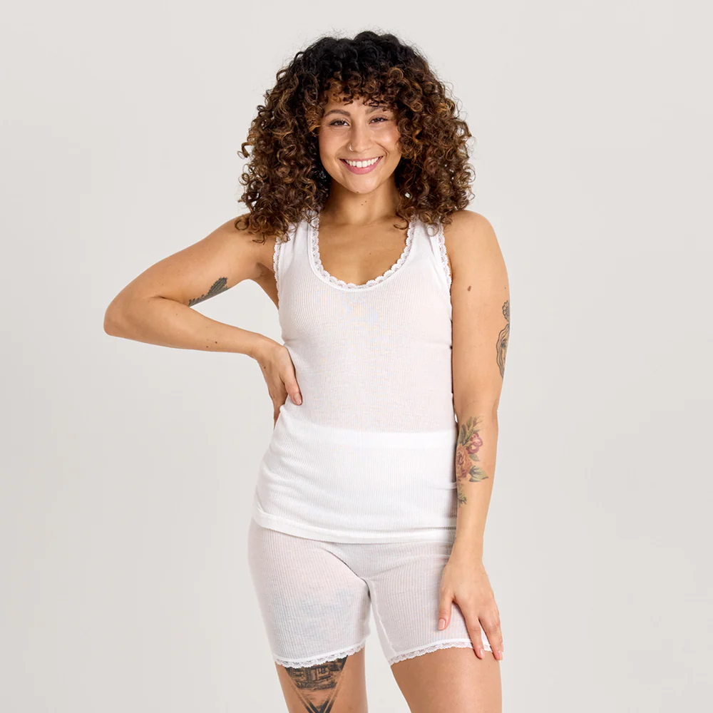 Naisten hihaton laamapaita on ohut ja joustavasta 100% puuvillaneuloksesta valmistettu hihaton toppi, jossa ei ole sivusaumoja. Pääntiessä ja hihansuissa oleva kaunis pitsi tuo ripauksen pehmeyttä ja tekee hihattomasta paidasta tyylikkään valinnan jokaiseen asuun. Hihaton paita sopii arkeen, kesäpäiville ja kerrospukeutumiseen.