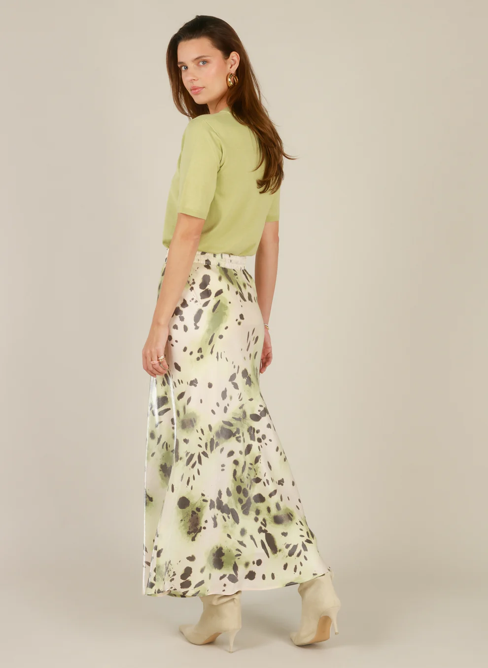 Upeasti valoa heijastava kangas! Vaalealla pohjalla vihreää ja tummaa täplikästä kuviointia. Helmassa kellotusta, joten hame ottaa liikkeen kauniisti. Vyötäröllä hyvin joustava leveähkö kuminauha ja kiristysnarut. Huomioi kokoa valitessa, että materiaali ei jousta yhtään.