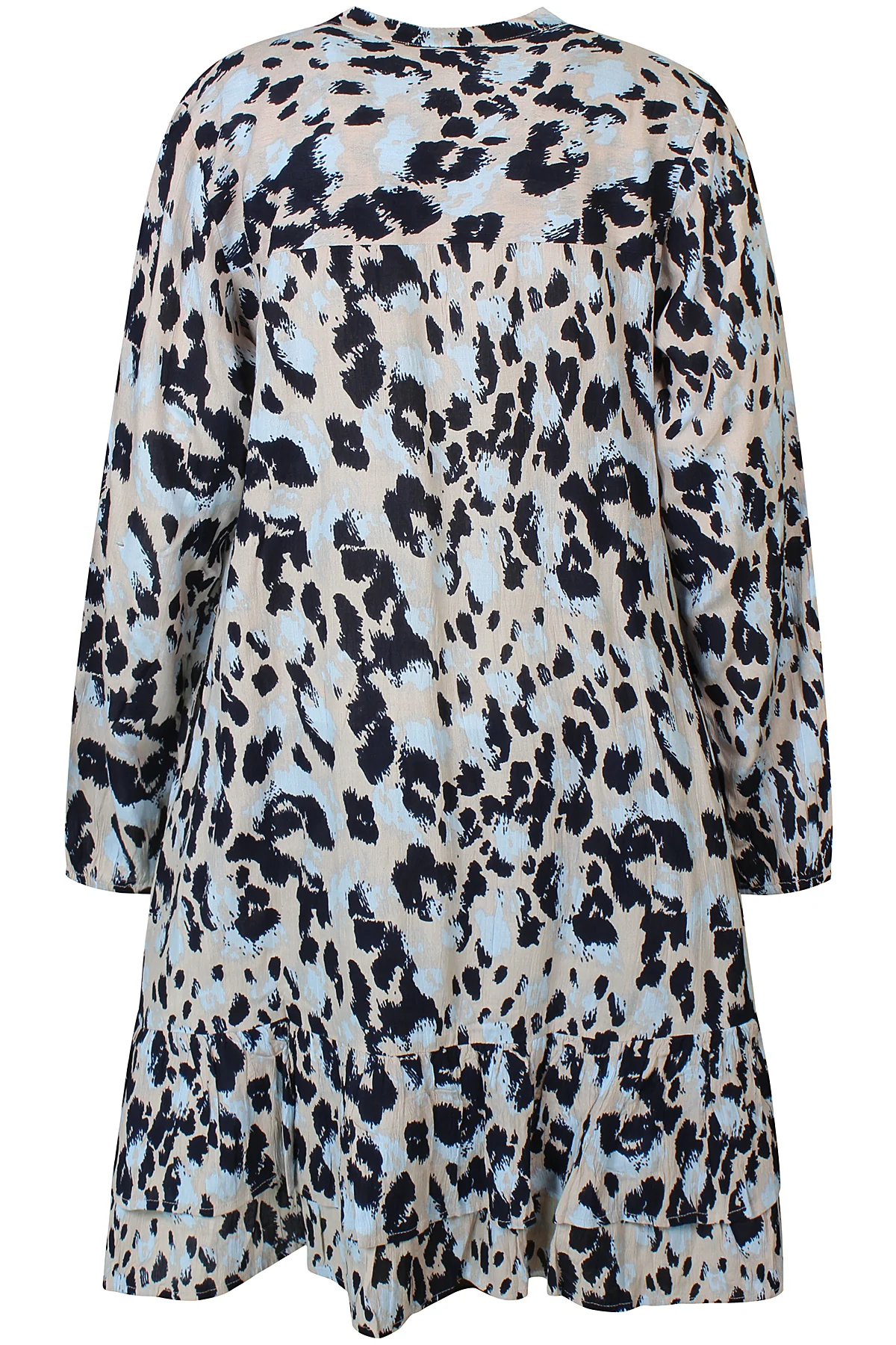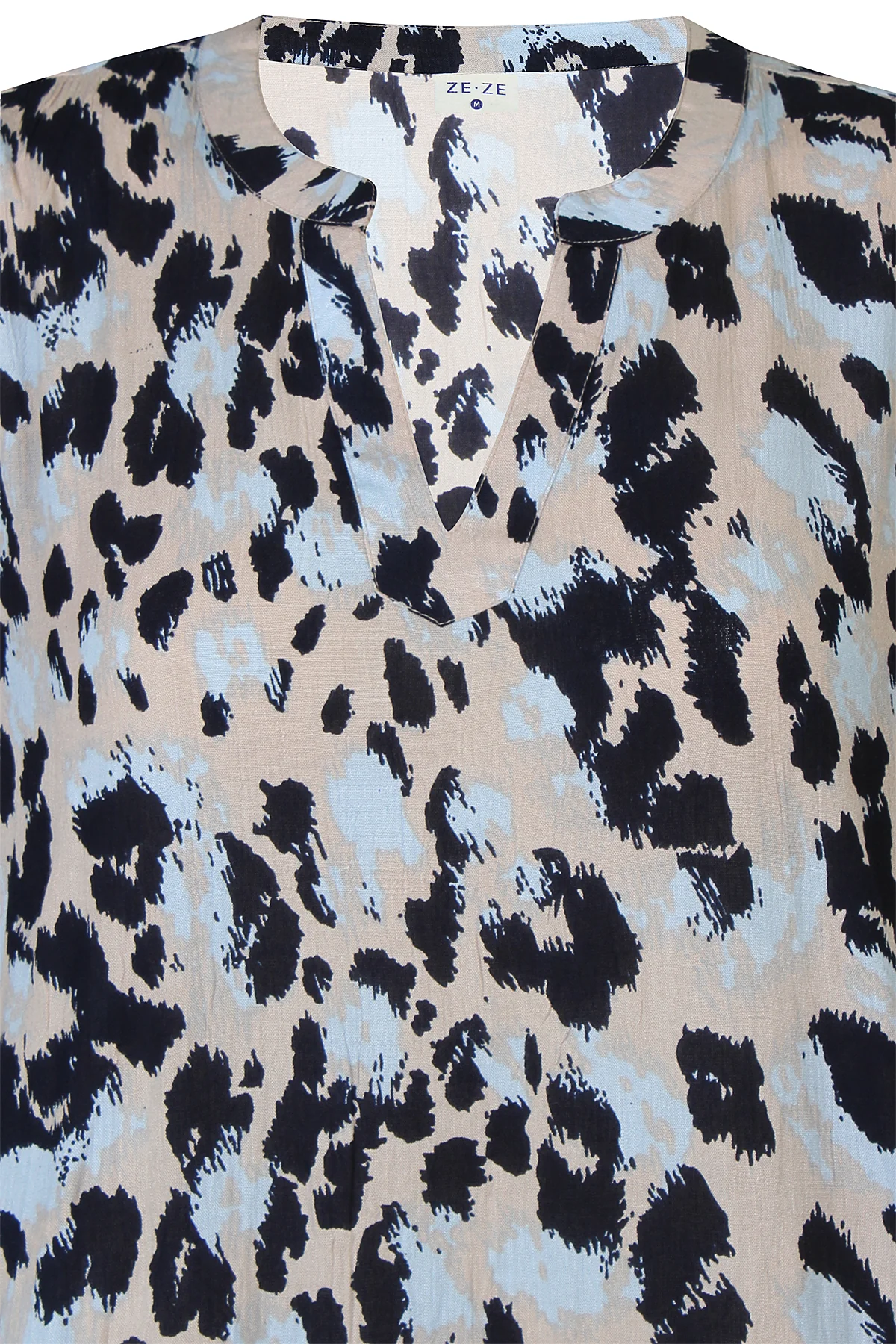 Harmahtavan beigellä pohjalla vaaleansinistä ja mustaa kuviointia. Pitkät hihat, joissa on kuminauhat hihansuissa. Sivusaumataskut molemmin puolin! Pääntie on V-muotoinen, joka on viimeistelty päärmeellä. Helmaa koristaa kaksikerroksinen frilla.